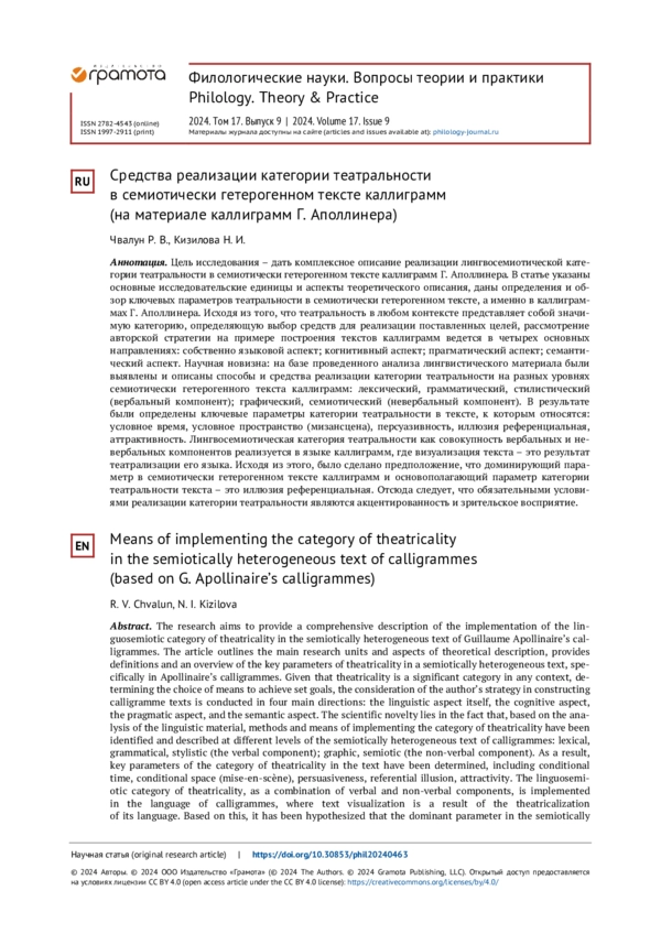 Цель исследования - дать комплексное описание реализации лингвосемиотической категории театральности в семиотически гетерогенном тексте каллиграмм Г. Аполлинера. В статье указаны основные исследовательские единицы и аспекты теоретического описания, даны определения и обзор ключевых параметров театральности в семиотически гетерогенном тексте, а именно в каллиграммах Г. Аполлинера. Исходя из того, что театральность в любом контексте представляет собой значимую категорию, определяющую выбор средств для реализации поставленных целей, рассмотрение авторской стратегии на примере построения текстов каллиграмм ведется в четырех основных направлениях: собственно языковой аспект; когнитивный аспект; прагматический аспект; семантический аспект. Научная новизна: на базе проведенного анализа лингвистического материала были выявлены и описаны способы и средства реализации категории театральности на разных уровнях семиотически гетерогенного текста каллиграмм: лексический, грамматический, стилистический (вербальный компонент); графический, семиотический (невербальный компонент). В результате были определены ключевые параметры категории театральности в тексте, к которым относятся: условное время, условное пространство (мизансцена), персуазивность, иллюзия референциальная, аттрактивность. Лингвосемиотическая категория театральности как совокупность вербальных и невербальных компонентов реализуется в языке каллиграмм, где визуализация текста - это результат театрализации его языка. Исходя из этого, было сделано предположение, что доминирующий параметр в семиотически гетерогенном тексте каллиграмм и основополагающий параметр категории театральности текста - это иллюзия референциальная. Отсюда следует, что обязательными условиями реализации категории театральности являются акцентированность и зрительское восприятие.