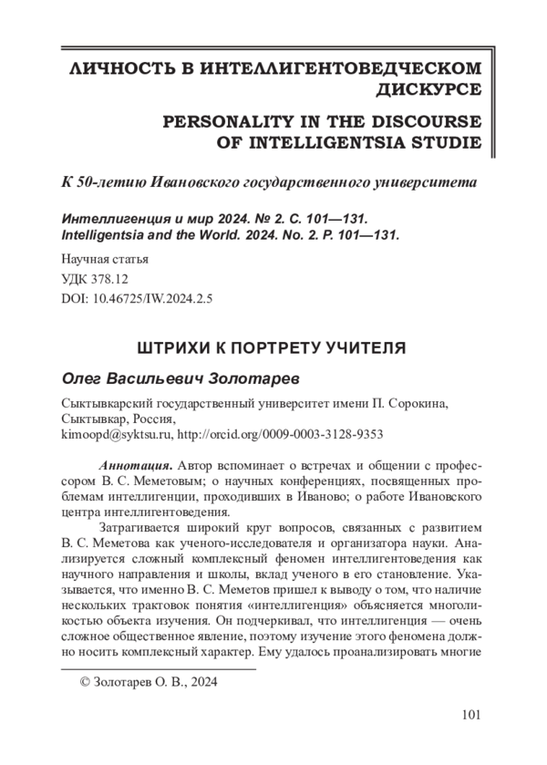 3 Золотарев О. В. Основатель интеллигентоведения // Интеллигенция и мир. 2020. № 1. С. 33—40.