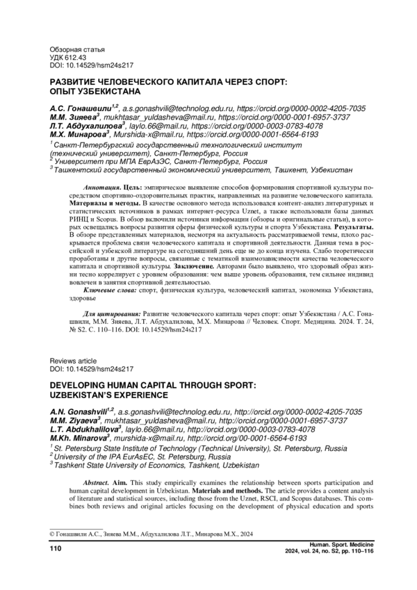 Цель: эмпирическое выявление способов формирования спортивной культуры посредством спортивно-оздоровительных практик, направленных на развитие человеческого капитала. Материалы и методы. В качестве основного метода использовался контент-анализ литературных и статистических источников в рамках интернет-ресурса Uznet, а также использовали базы данных РИНЦ и Scopus. В обзор включили источники информации (обзоры и оригинальные статьи), в которых освещались вопросы развития сферы физической культуры и спорта Узбекистана. Результаты. В обзоре представленных материалов, несмотря на актуальность рассматриваемой темы, плохо раскрывается проблема связи человеческого капитала и спортивной деятельности. Данная тема в российской и узбекской литературе на сегодняшний день еще не до конца изучена. Слабо теоретически проработаны и другие вопросы, связанные с тематикой взаимозависимости качества человеческого капитала и спортивной культуры. Заключение. Авторами было выявлено, что здоровый образ жизни тесно коррелирует с уровнем образования: чем выше уровень образования, тем сильнее индивид вовлечен в занятия спортивной деятельностью.