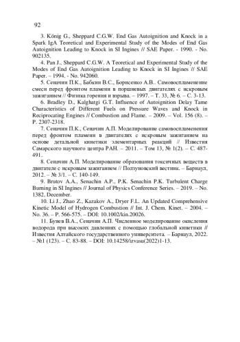 5. Сеначин П.К., Бабкин В.С., Борисенко А.В. Самовоспламенение смеси перед фронтом пламени в поршневых двигателях с искровым зажиганием // Физика горения и взрыва. - 1997. - Т.33, №6. - С. 3-13. EDN: MOYFTF