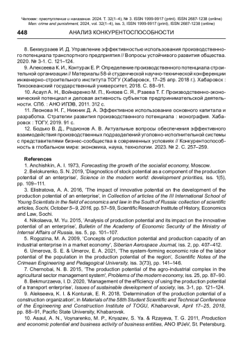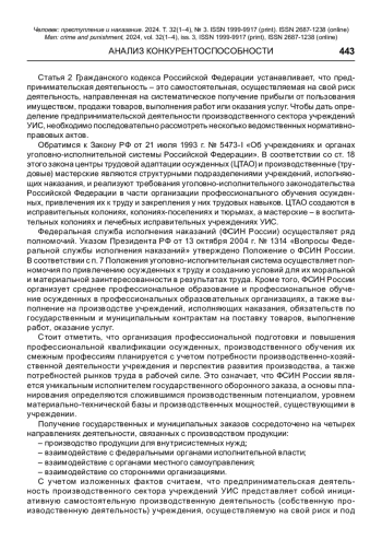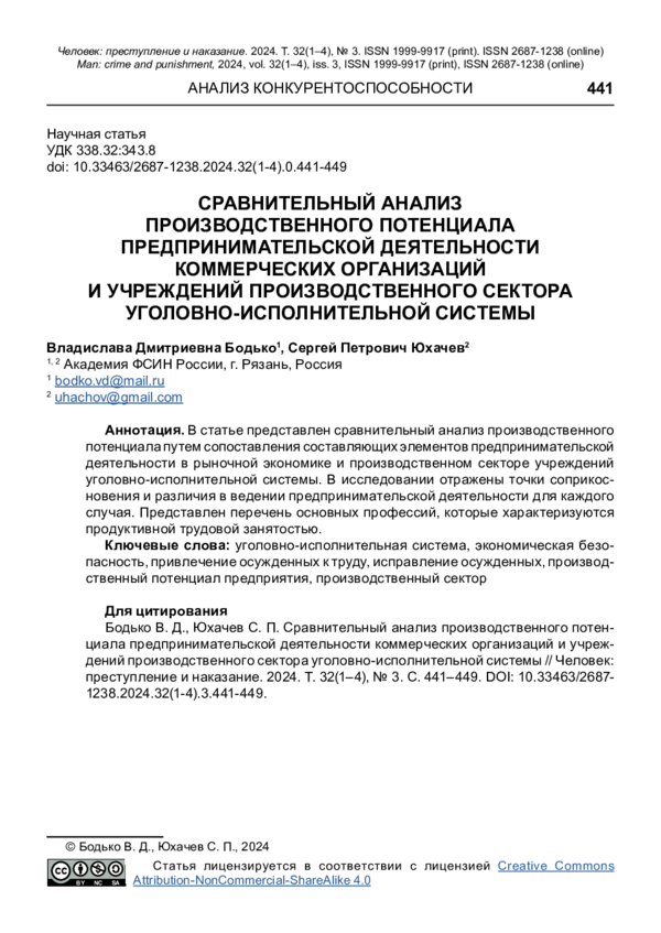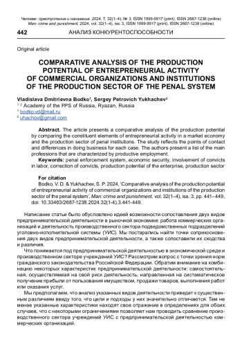 Статья: СРАВНИТЕЛЬНЫЙ АНАЛИЗ ПРОИЗВОДСТВЕННОГО ПОТЕНЦИАЛА ПРЕДПРИНИМАТЕЛЬСКОЙ ДЕЯТЕЛЬНОСТИ КОММЕРЧЕСКИХ ОРГАНИЗАЦИЙ И УЧРЕЖДЕНИЙ ПРОИЗВОДСТВЕННОГО СЕКТОРА УГОЛОВНО-ИСПОЛНИТЕЛЬНОЙ СИСТЕМЫ (2024)