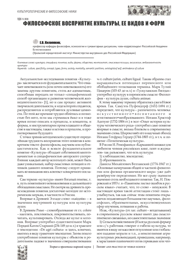 Цель исследования на основе культурно-философского подхода заключается в анализе понятия «Культура», которое относится к числу фундаментальных. Задачами исследования становится определение особенностей видов и форм культуры. Теоретико-методологическим фундаментом исследования на основе логических построений послужил анализ и синтез информационных ресурсов, рассматривающих понятие «Культура» во всем многообразия ее проявления в обществе на разных этапах его развития. В ходе исследования определено, что культура выступает, как специфический способ организации и развития человеческой жизнедеятельности». Выявлено, что с точки зрения методической есть определённая трудность восприятия понятия «Культура» в конкретном тексте: философском, научном или публицистическом. Установлено что, как и всякое фундаментальное понятие «Культура» обладает собственной многозначностью и специфичностью авторского употребления: каждый автор использует свой, может быть даже уникальный, набор смысловых позиций и оттенков данного понятия. Определено что, говоря о менталитете, общество рассматривается с точки зрения структур мышления, национальный характер - рассматриваем психологически, мораль - аксиологически, стиль - бихевиористски, образование - ретрансляционное, но понятие культура объемлет всё это, добавляя ещё и больший смысл. Амбивалентность культуры заключается в том, что с одной стороны, она - набор всевозможных ограничений, а значит и принуждений. А с другой - она и только она позволяет человеку, переживая, проникновенно прикоснуться к сокровищницам даров человеческих.