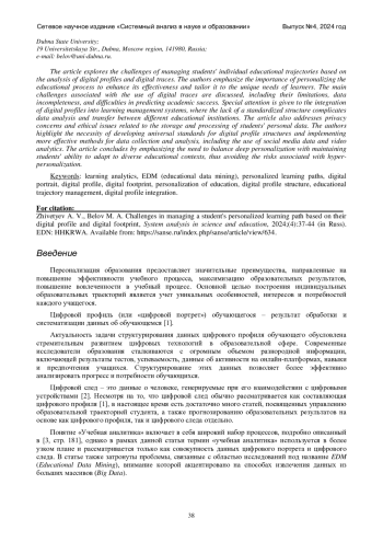 В статье исследуются проблемы управления индивидуальной образовательной траекторией (ИОТ) студентов, базирующейся на анализе цифрового профиля и цифрового следа. Авторы подчеркивают значимость персонализации образовательного процесса для повышения его эффективности и адаптации к уникальным потребностям учащихся. Рассматриваются основные вызовы, связанные с использованием цифрового следа, включая его ограниченность, неполноту данных и сложности при прогнозировании академической успешности. Особое внимание уделено вопросам интеграции цифрового профиля в системы управления обучением, где отсутствие единой стандартизированной структуры затрудняет анализ и перенос данных между различными образовательными учреждениями. Также обсуждаются угрозы конфиденциальности и этические аспекты, связанные с хранением и обработкой личных данных студентов. Авторы подчеркивают необходимость разработки универсальных стандартов для структуры цифрового профиля, а также внедрения более эффективных методов сбора и анализа данных, включая использование данных социальных сетей и видеоаналитики. В заключение статьи акцентируется внимание на необходимости нахождения баланса между глубоким уровнем персонализации и сохранением способности студентов адаптироваться к разнообразным образовательным контекстам, чтобы избежать риска гиперперсонализации.