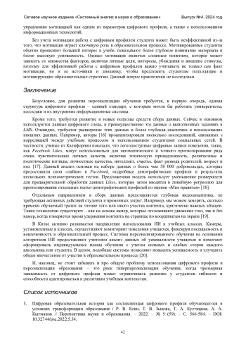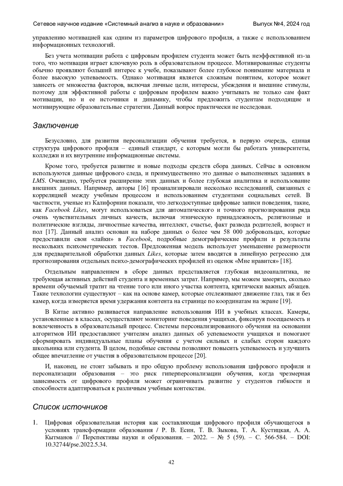 1. Цифровая образовательная история как составляющая цифрового профиля обучающегося в условиях трансформации образования / Р. В. Есин, Т. В. Зыкова, Т. А. Кустицкая, А. А. Кытманов // Перспективы науки и образования. - 2022. - № 5 (59). - С. 566-584. -. DOI: 10.32744/pse.2022.5.34 EDN: OMTHCN