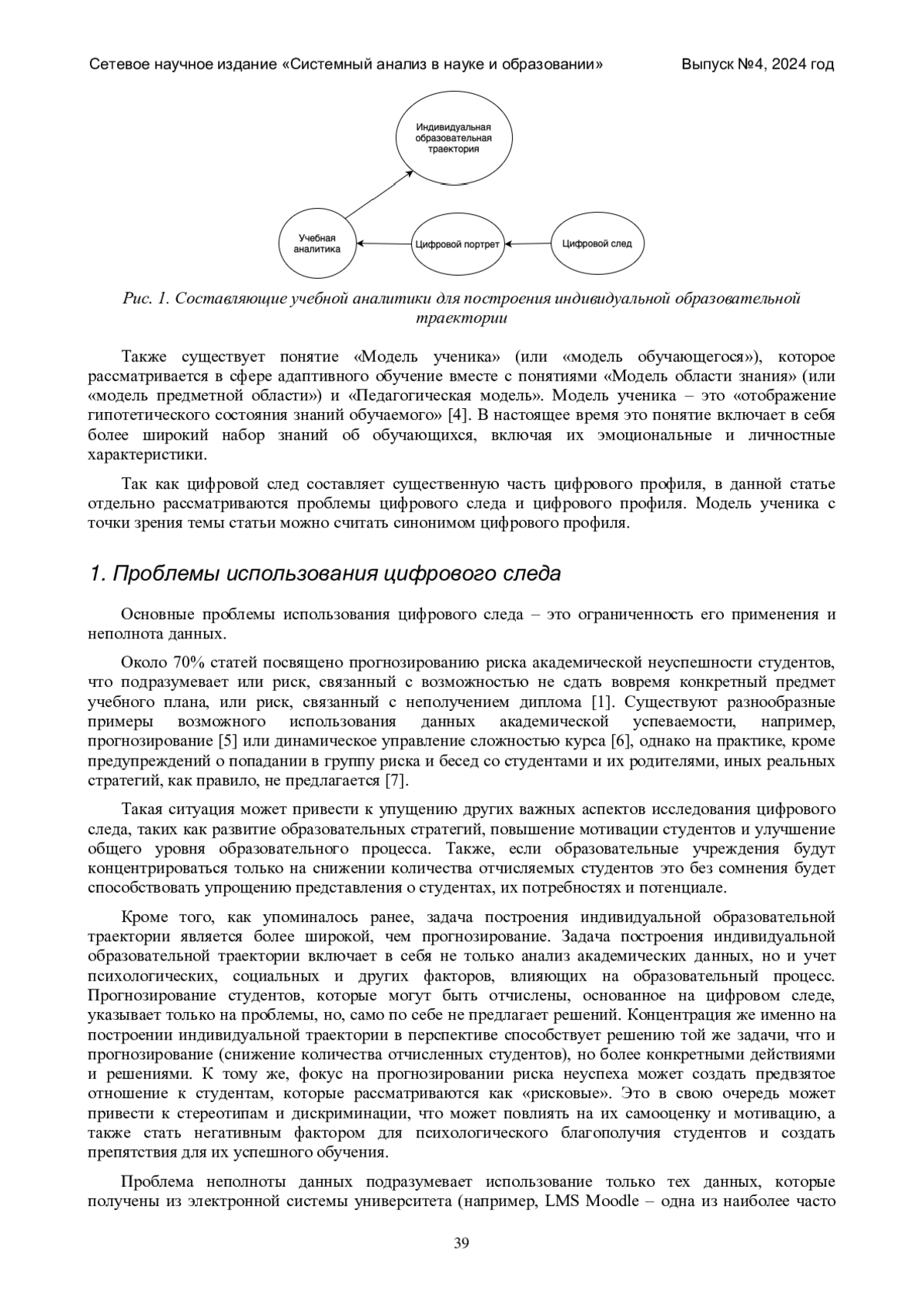 Цифровой след – это данные о человеке, генерируемые при его взаимодействии с цифровыми устройствами [2]. Несмотря на то, что цифровой след обычно рассматривается как составляющая цифрового профиля [1], в настоящее время есть достаточно много статей, посвященных управлению образовательной траекторией студента, а также прогнозированию образовательных результатов на основе как цифрового профиля, так и цифрового следа отдельно. Понятие «Учебная аналитика» включает в себя широкий набор процессов, подробно описанный в [3, стр. 181], однако в рамках данной статьи термин «учебная аналитика» используется в более узком плане и рассматривается только как совокупность данных цифрового портрета и цифрового следа. В статье также затронуты проблемы, связанные с областью исследований под название EDM (Educational Data Mining), внимание которой акцентировано на способах извлечения данных из больших массивов (Big Data).