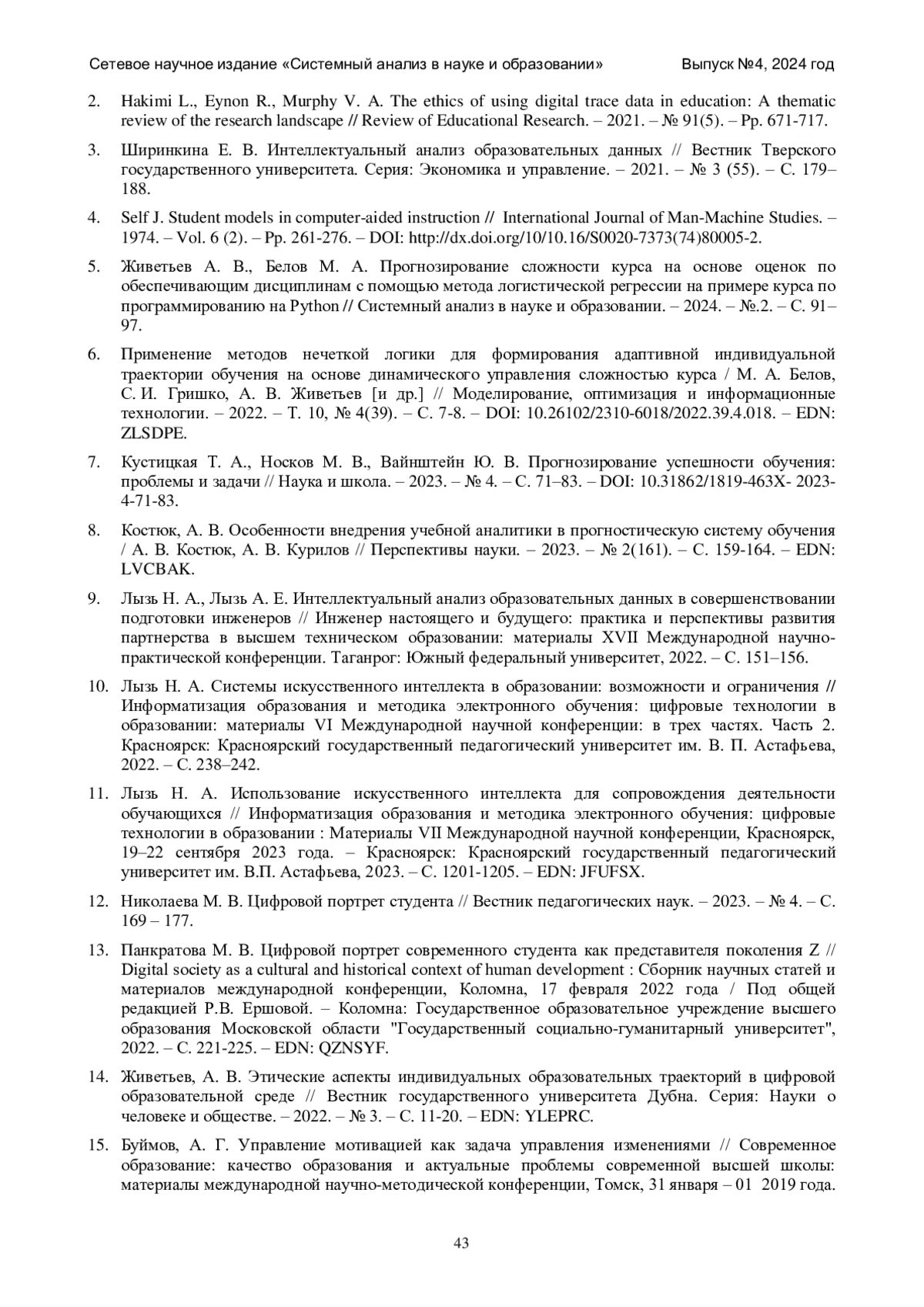 3. Ширинкина Е. В. Интеллектуальный анализ образовательных данных // Вестник Тверского государственного университета. Серия: Экономика и управление. - 2021. - № 3 (55). - С. 179-188. EDN: ZKOGBS