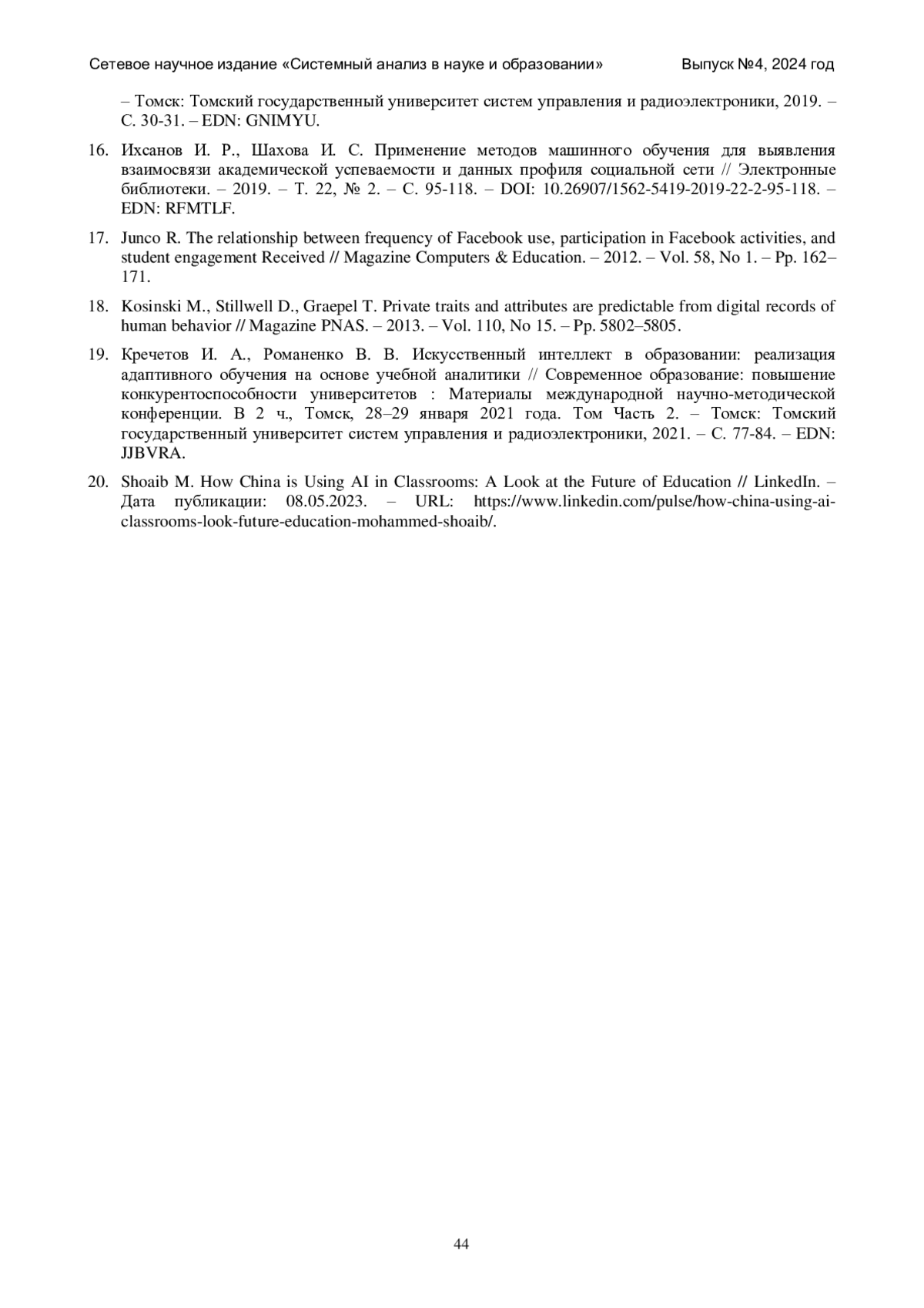 16. Ихсанов И. Р., Шахова И. С. Применение методов машинного обучения для выявления взаимосвязи академической успеваемости и данных профиля социальной сети // Электронные библиотеки. - 2019. - Т. 22, № 2. - С. 95-118. - -. DOI: 10.26907/1562-5419-2019-22-2-95-118 EDN: RFMTLF
