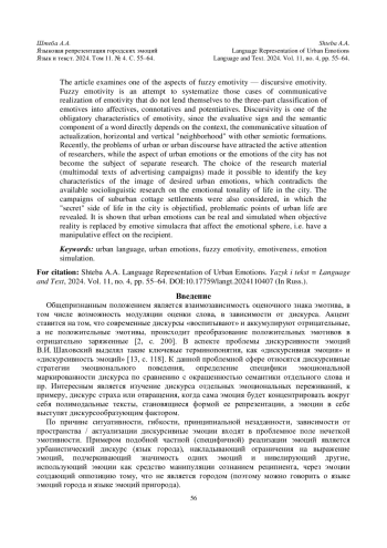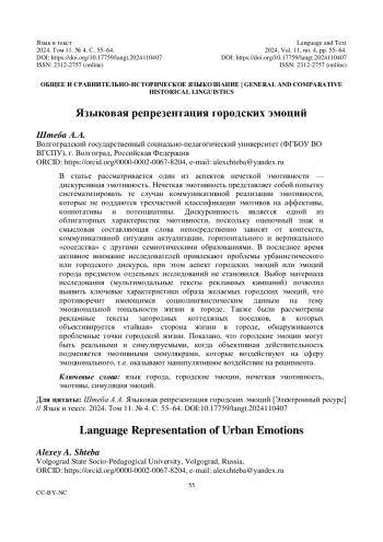 В статье рассматривается один из аспектов нечеткой эмотивности - дискурсивная эмотивность. Нечеткая эмотивность представляет собой попытку систематизировать те случаи коммуникативной реализации эмотивности, которые не поддаются трехчастной классификации эмотивов на аффективы, коннотативы и потенциативы. Дискурсивность является одной из облигаторных характеристик эмотивности, поскольку оценочный знак и смысловая составляющая слова непосредственно зависят от контекста, коммуникативной ситуации актуализации, горизонтального и вертикального «соседства» с другими семиотическими образованиями. В последнее время активное внимание исследователей привлекают проблемы урбанистического или городского дискурса, при этом аспект городских эмоций или эмоций города предметом отдельных исследований не становился. Выбор материала исследования (мультимодальные тексты рекламных кампаний) позволил выявить ключевые характеристики образа желаемых городских эмоций, что противоречит имеющимся социолингвистическим данным на тему эмоциональной тональности жизни в городе. Также были рассмотрены рекламные тексты загородных коттеджных поселков, в которых объективируется «тайная» сторона жизни в городе, обнаруживаются проблемные точки городской жизни. Показано, что городские эмоции могут быть реальными и симулируемыми, когда объективная действительность подменяется эмотивными симулякрами, которые воздействуют на сферу эмоционального, т. е. оказывают манипулятивное воздействие на реципиента.