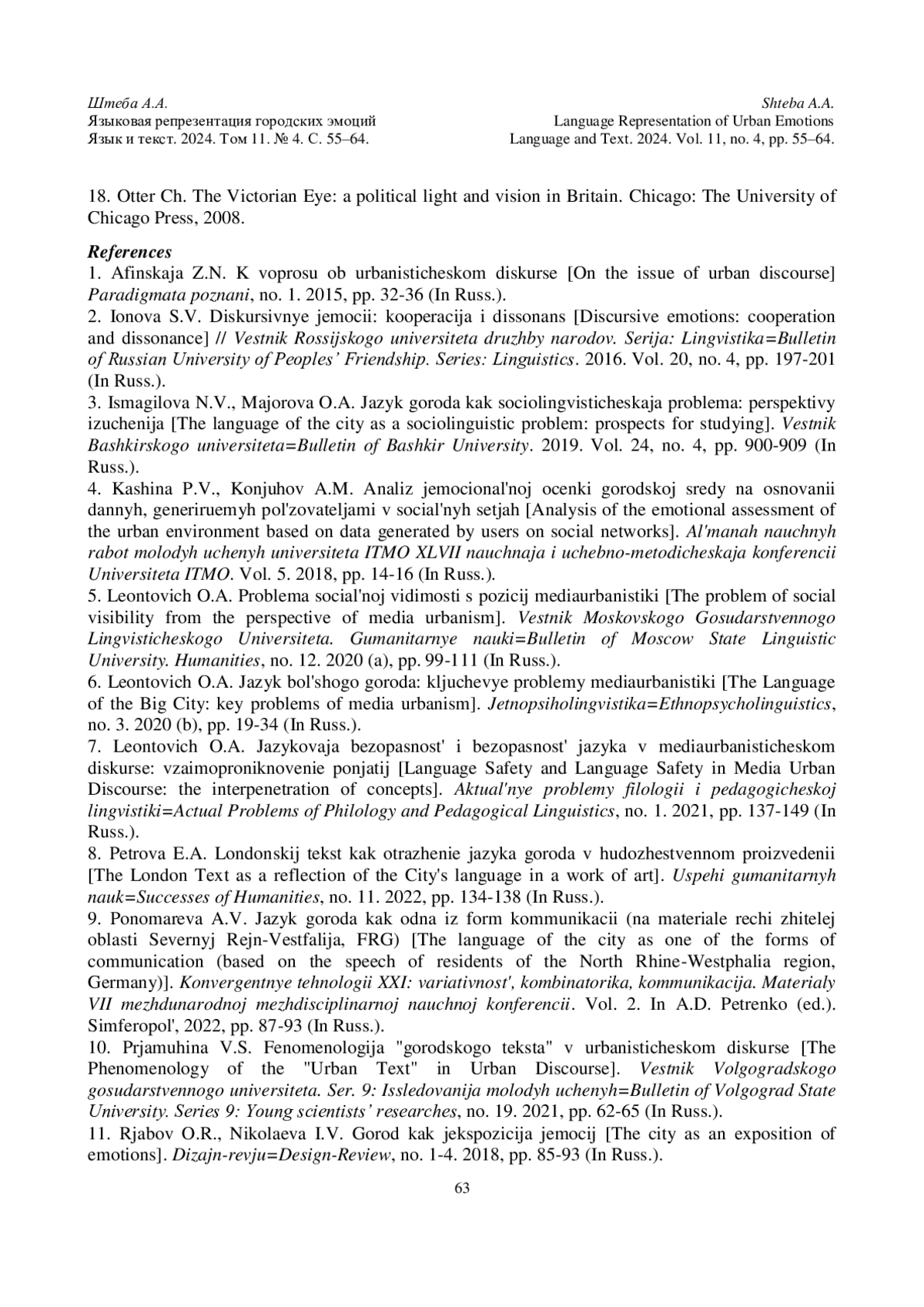 8. Петрова Е.А. Лондонский текст как отражение языка города в художественном произведении // Успехи гуманитарных наук. № 11. 2022. С. 134-138. EDN: ZFOKMQ