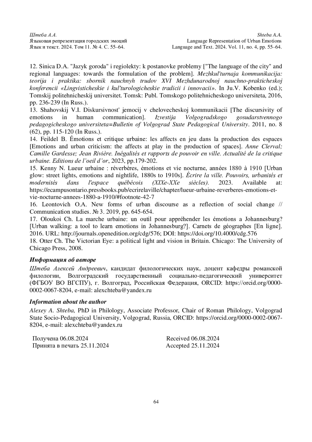 10. Прямухина В.С. Феноменология “городского текста” в урбанистическом дискурсе // Вестник Волгоградского государственного университета. Сер. 9: Исследования молодых ученых. № 19. 2021. С. 62-65. EDN: WHJQZQ