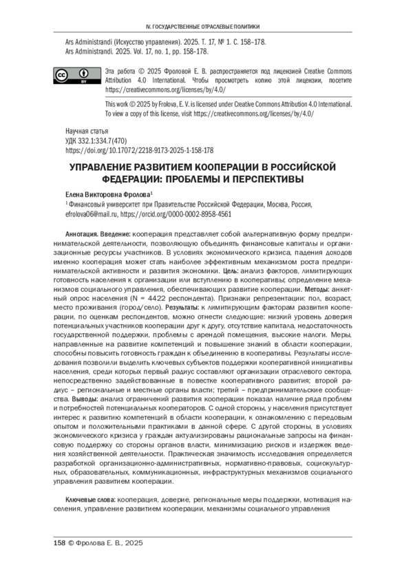 - Фролова Е. В., Рогач О. В. Доверие как фактор развития кооперации в России // Мониторинг общественного мнения: экономические и социальные перемены. 2023. № 6. С. 35–57. https://doi.org/10.14515/monitoring.2023.6.2405. EDN: EQPMTZ.