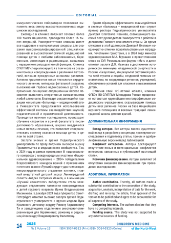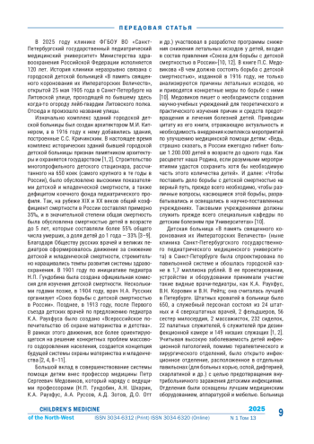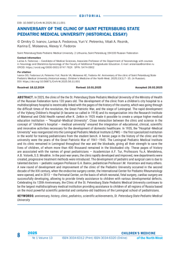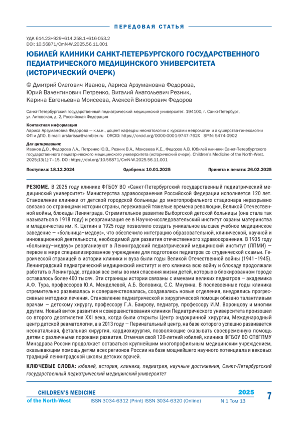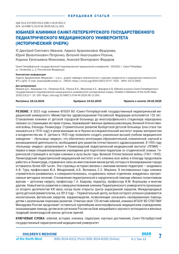 В 2025 году клинике ФГБОУ ВО «Санкт-Петербургский государственный педиатрический медицинский университет» Министерства здравоохранения Российской Федерации исполняется 120 лет. Становление клиники от детской городской больницы до многопрофильного стационара неразрывно связано со страницами истории страны, пережившей тяжелые времена революции, Великой Отечественной войны, блокады Ленинграда. Стремительное развитие Выборгской детской больницы (она стала так называться в 1918 году) и реорганизация ее в Научно-исследовательский институт охраны материнства и младенчества им. К. Цеткин в 1925 году позволило создать уникальное высшее учебное медицинское заведение — «больница–медвуз», что обеспечило интеграцию образовательной, клинической, научной и инновационной дея тельности, необходимой для развития отечественного здравоохранения. В 1935 году «больницу–медвуз» реорганизуют в Ленинградский педиатрический медицинский институт (ЛПМИ) — первое в мире специа лизированное учреждение для подготовки педиатров со студенческой скамьи. Героической страницей в истории клиники и вуза были годы Великой Отечественной войны (1941–1945). Ленинградский педиат рический медицинский институт и его клиника всю войну и блокаду продолжали работать в Ленинграде, отдавая все силы во имя спасения жизни детей, которых в блокированном городе оставалось более 400 тысяч. Эти страницы истории связаны с именами великих педиатров — академика А. Ф. Тура, профессоров Ю. А. Менделевой, А. Б. Воловика, С. С. Мнухина. В послевоенные годы клиника стремительно развивалась и совершенствовалась, создавались новые отделения, внедрялись прогрессивные методики лечения. Становление педиатрической и хирургической помощи обязано талантливым врачам — детскому хирургу, профессору Г. А. Баирову, педиатру, профессору И. М. Воронцову и многим другим. Новый виток развития и совершенствования клиники Педиатрического университета произошел со второго десятилетия XXI века, когда были открыты Центр эндокринной хирургии, Международный центр детской ревматологии, а в 2013 году — Перинатальный центр, на базе которого успешно развивается неонатальная, фетальная хирургия, кардиохирургия, позволяющие оказывать своевременную помощь детям с различными пороками развития. Отмечая свой 120-летний юбилей, клиника ФГБОУ ВО СПбГПМУ Минздрава России продолжает оставаться крупнейшим многопрофильным медицинским учреждением, оказывающим помощь детям всех регионов России на базе мощнейшего научного потенциала и вековых традиций ленинградской школы детских врачей.
