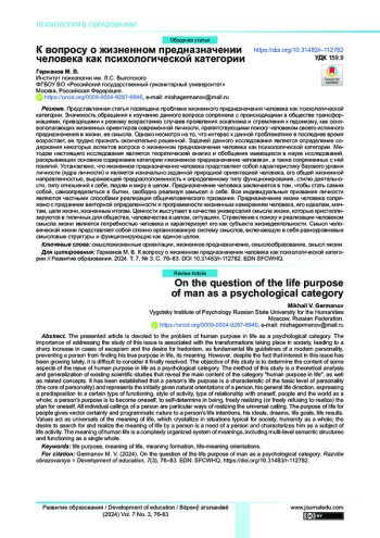 Представленная статья посвящена проблеме жизненного предназначения человека как психологической категории. Значимость обращения к изучению данного вопроса сопряжена с происходящими в обществе трансформациями, приводящими к резкому возрастанию случаев проявления эскапизма и стремления к гедонизму, как основополагающих жизненных ориентиров современной личности, препятствующими поиску человеком своего истинного предназначения в жизни, ее смысла. Однако несмотря на то, что интерес к данной проблематике в последнее время возрастает, ее трудно признать окончательно решенной. Задачей данного исследования является определение содержания некоторых аспектов вопроса о жизненном предназначении человека как психологической категории. Методом настоящего исследования является теоретический анализ и обобщение имеющихся в науке исследований, раскрывающих основное содержание категории «жизненное предназначение человека», а также сопряженных с ней понятий. Установлено, что жизненное предназначение человека представляет собой характеристику базового уровня личности (ядра личности) и является изначально заданной природной ориентацией человека, его общей жизненной направленностью, выражающей предрасположенность к определенному типу функционирования, стилю деятельности, типу отношений к себе, людям и миру в целом. Предназначение человека заключается в том, чтобы стать самим собой, самоопределиться в бытии, свободно реализуя замысел о себе. Все индивидуальные призвания личности являются частными способами реализации общечеловеческого призвания. Предназначение жизни человека сопряжено с приданием векторной определенности и программности жизненным намерениям человека, его идеалам, мечтам, цели жизни, жизненным итогам. Ценности выступают в качестве универсалий смысла жизни, которые кристаллизируются в типичных для общества, человечества в целом, ситуациях. Стремление к поиску и реализации человеком смысла жизни является потребностью человека и характеризует его как субъекта жизнедеятельности. Смысл человеческой жизни представляет собой сложно организованную систему смыслов, включающую в себя разноуровневые смысловые структуры и функционирующую как единое целое.