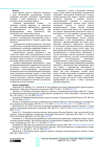 5. Двоеглазова М. Ю. Смысл жизни как детерминанта проявления социальной сущности личности // Азимут научных исследований: педагогика и психология. 2021. №4 (37). С. 308-312. DOI: 10.26140/anip-2021-1004-0072 EDN: TQZTOT