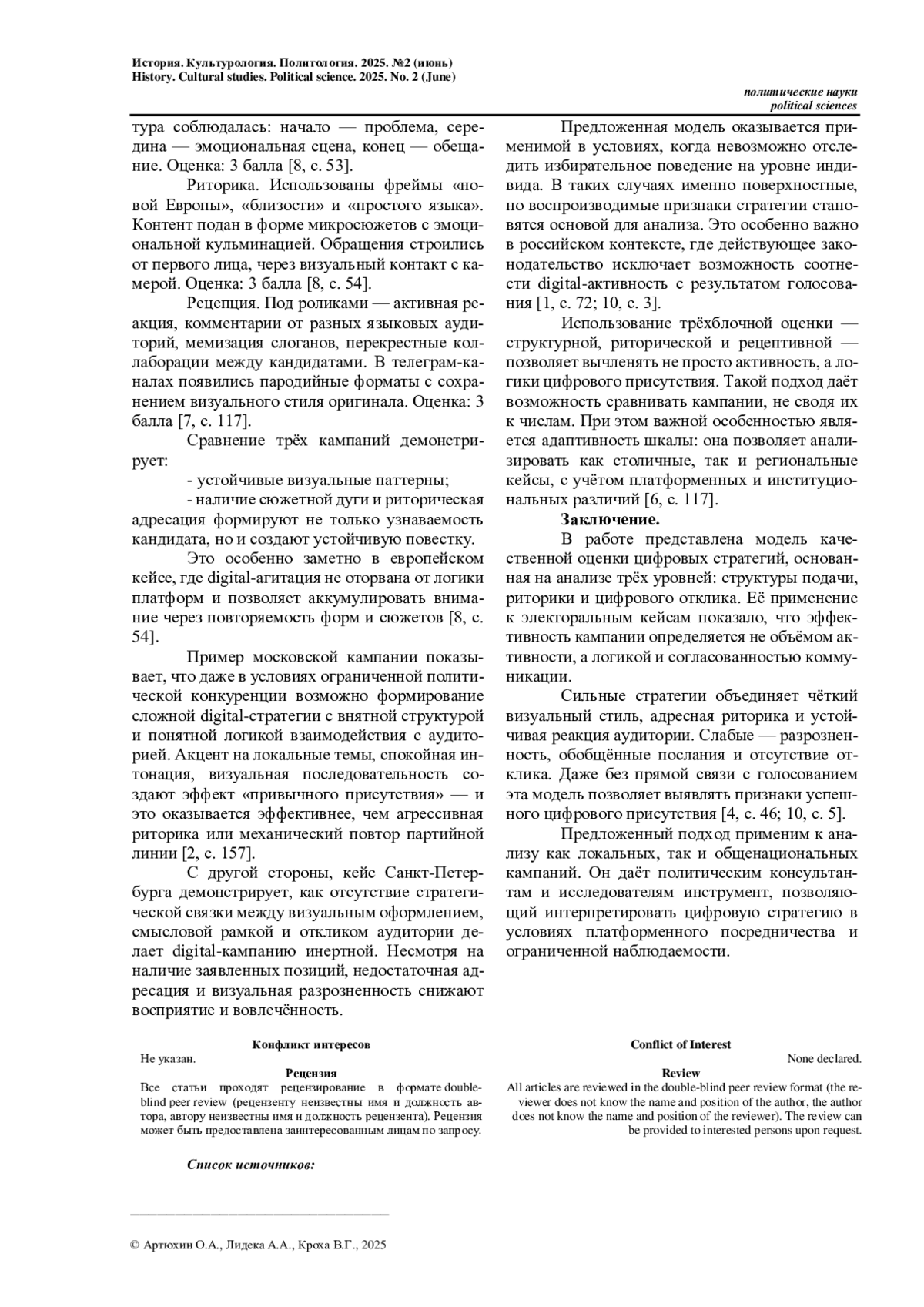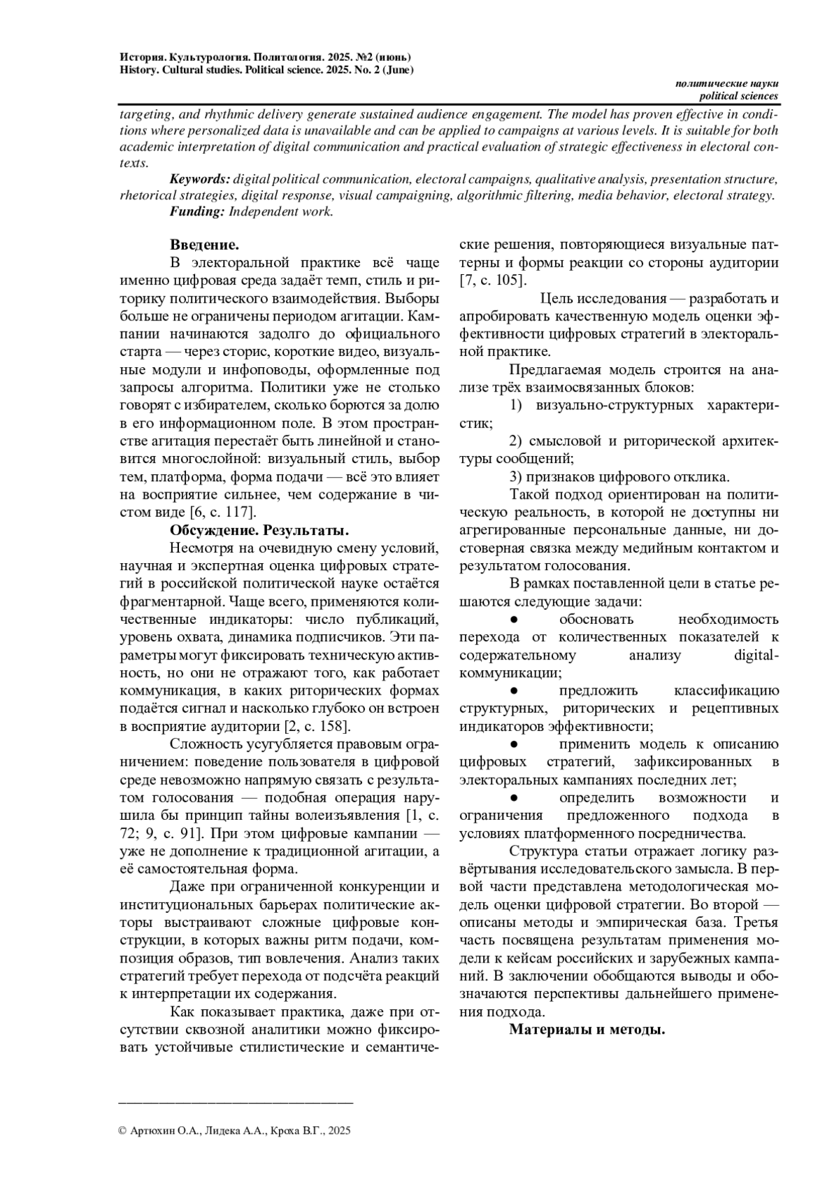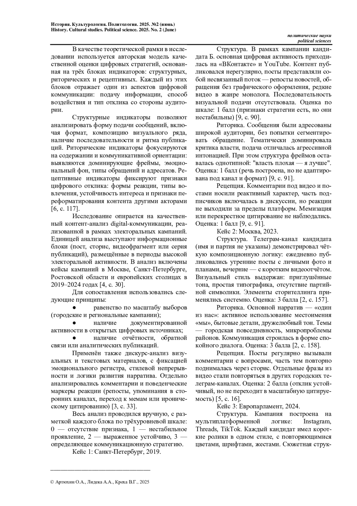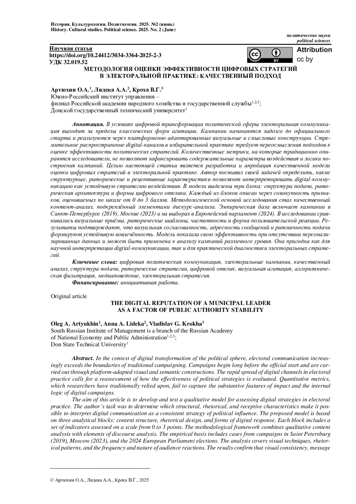 В условиях цифровой трансформации политической сферы электоральная коммуникация выходит за пределы классических форм агитации. Кампании начинаются задолго до официального старта и реализуются через платформенно адаптированные визуальные и смысловые конструкции. Стремительное распространение digital-каналов в избирательной практике требует переосмысления подходов к оценке эффективности политических стратегий. Количественные метрики, на которые традиционно опираются исследователи, не позволяют зафиксировать содержательные параметры воздействия и логики построения кампаний. Целью настоящей статьи является разработка и апробация качественной модели оценки цифровых стратегий в электоральной практике. Автор поставил своей задачей определить, какие структурные, риторические и рецептивные характеристики позволяют интерпретировать digital-коммуникацию как устойчивую стратегию воздействия. В модели выделены три блока: структура подачи, риторическая архитектура и формы цифрового отклика. Каждый из блоков описан через совокупность признаков, оцениваемых по шкале от 0 до 3 баллов. Методологической основой исследования стал качественный контент-анализ, подкреплённый элементами дискурс-анализа. Эмпирическая база включает кампании в Санкт-Петербурге (2019), Москве (2023) и на выборах в Европейский парламент (2024). В исследовании сравнивались визуальные приёмы, риторические шаблоны, частотность и форма пользовательской реакции. Результаты подтверждают, что визуальная согласованность, адресность сообщений и ритмичность подачи формируют устойчивую вовлечённость. Модель показала свою эффективность при отсутствии персонализированных данных и может быть применена к анализу кампаний различного уровня. Она пригодна как для научной интерпретации digital-коммуникации, так и для практической диагностики электоральных стратегий.