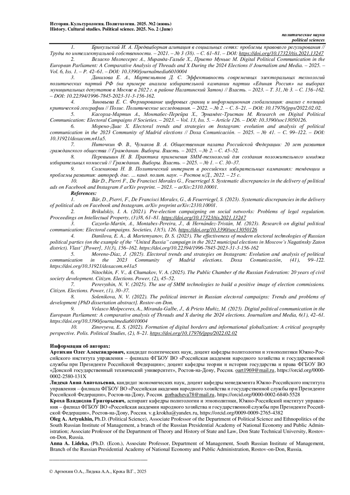 8. Перевышин Н. В. Практика применения SMM-технологий для создания положительного имиджа избирательных комиссий // Гражданин. Выборы. Власть. – 2025. – № 1. – С. 30–37.