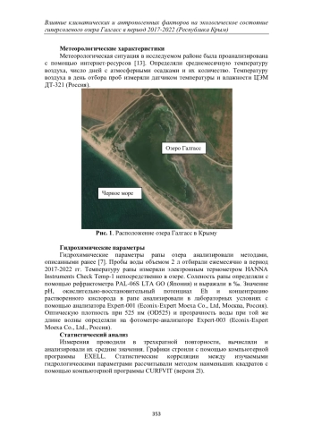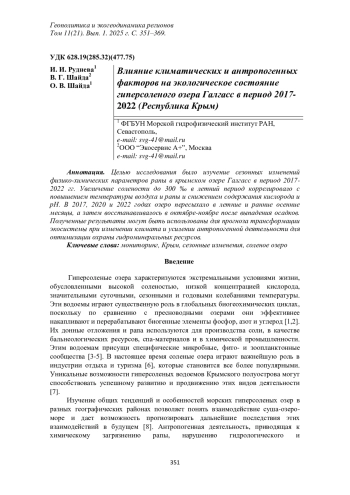 Целью исследования было изучение сезонных изменений физико-химических параметров рапы в крымском озере Галгасс в период 2017-2022 гг. Увеличение солености до 300 ‰ в летний период коррелировало с повышением температуры воздуха и рапы и снижением содержания кислорода и pH. В 2017, 2020 и 2022 годах озеро пересыхало в летние и ранние осенние месяцы, а затем восстанавливалось в октябре-ноябре после выпадения осадков. Полученные результаты могут быть использованы для прогноза трансформации экосистемы при изменении климата и усилении антропогенной деятельности для оптимизации охраны гидроминеральных ресурсов.