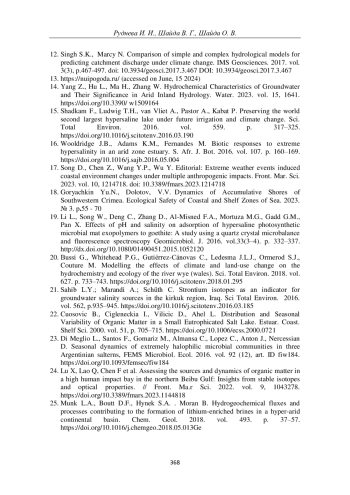 14. 	Yang Z., Hu L., Ma H., Zhang W. Hydrochemical Characteristics of Groundwater and Their Significance in Arid Inland Hydrology. // Water. 2023. vol.15, 1641. DOI: 10.3390/w1509164 EDN: KABERE