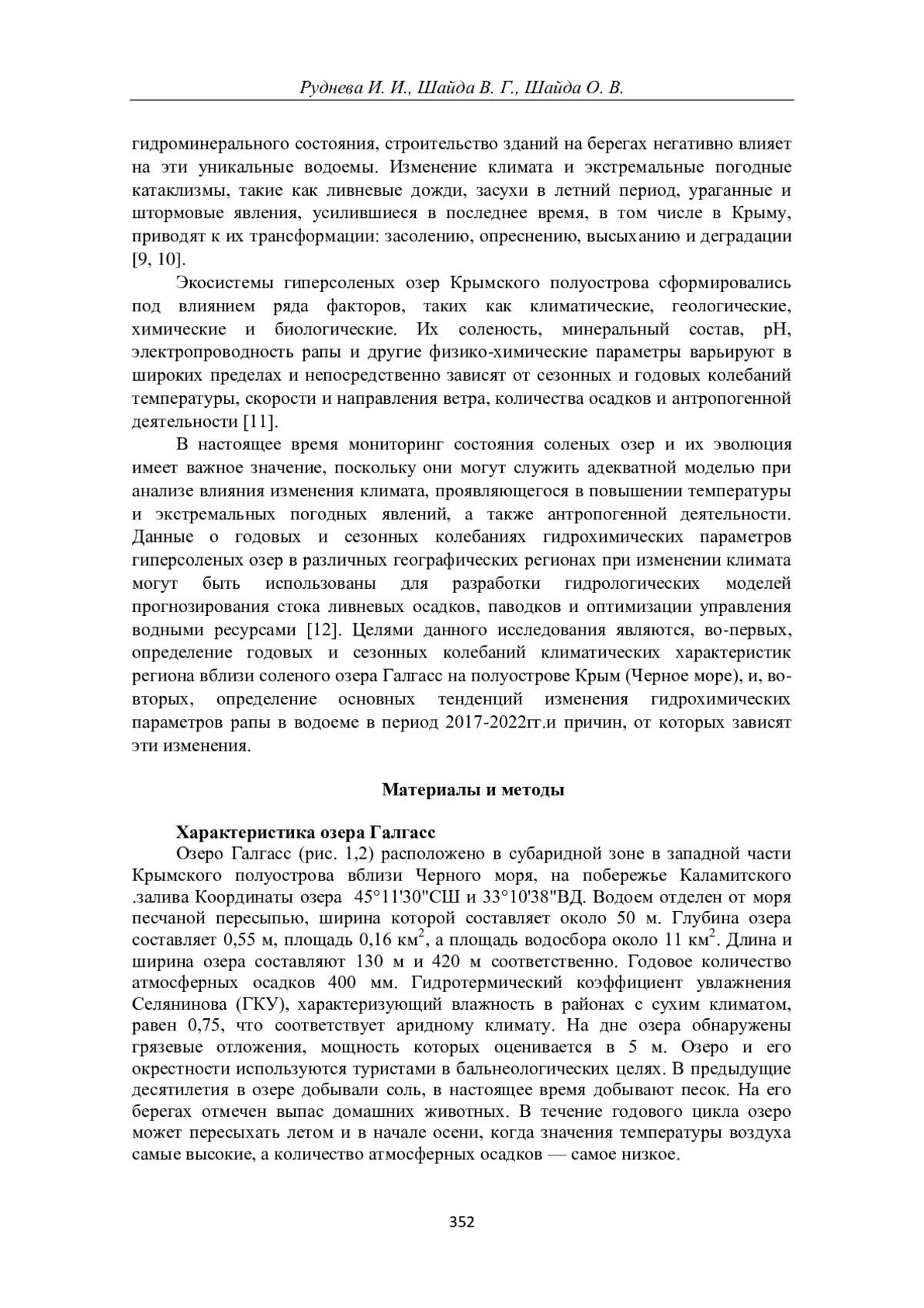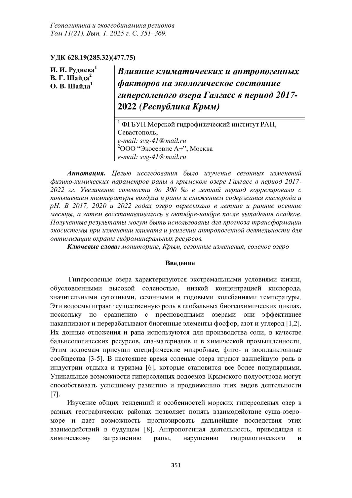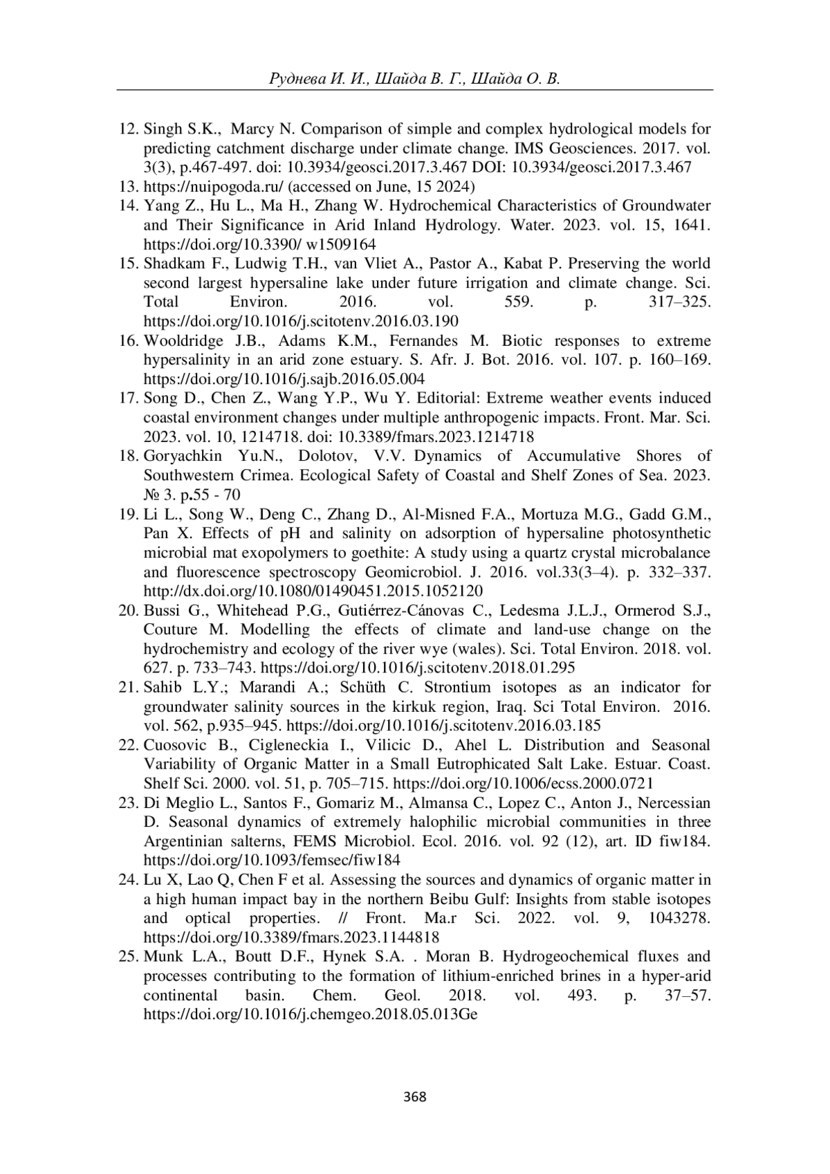 7. 	Rudneva I. I., Gaisky P. V., Shaida V. G., Shaida O. V. Assessing Climate and Human Activity Effects on Hypersaline Lake Ecosystem: Case Study of Saki Lake, Crimea. // Water. 2023. vol.15, 456. DOI: 10.3390/w15030456 EDN: DNKDJW