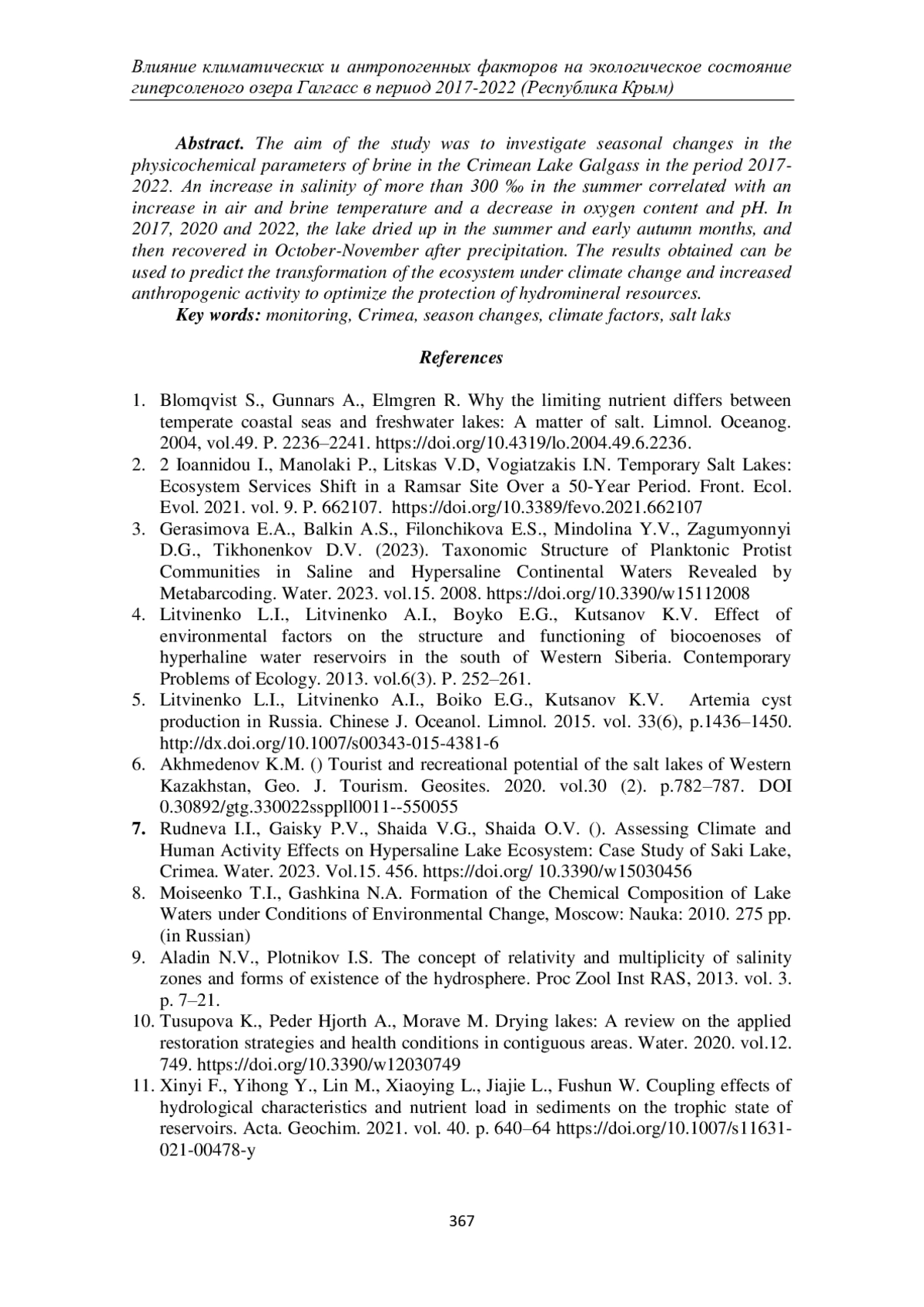 4. 	Litvinenko L. I., Litvinenko A. I., Boyko E. G., Kutsanov K.V. Effect of environmental factors on the structure and functioning of biocoenoses of hyperhaline water reservoirs in the south of Western Siberia. // Contemporary Problems of Ecology. 2013. vol.6(3). p. 252-261. EDN: RFHJKL