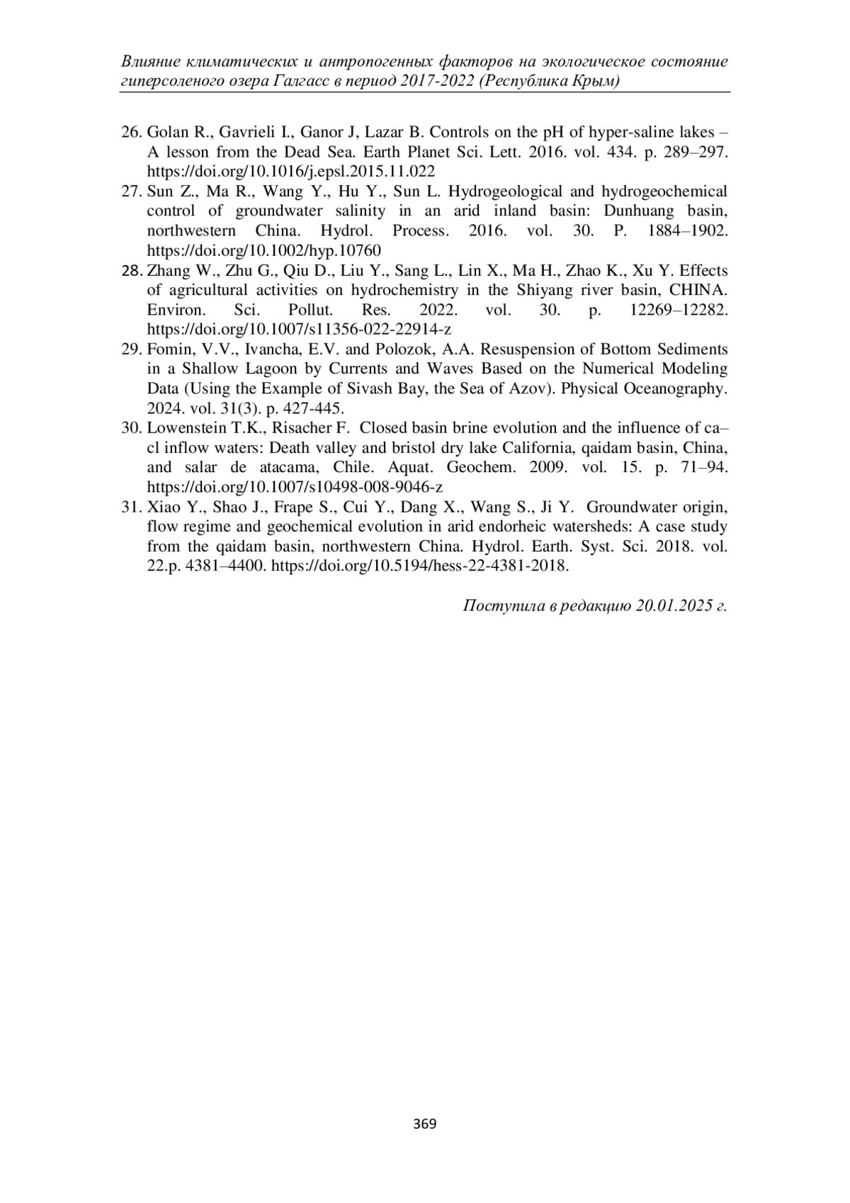 26. 	Golan R., Gavrieli I., Ganor J, Lazar B. Controls on the pH of hyper-saline lakes - A lesson from the Dead Sea. Earth Planet Sci. Lett. 2016. vol. 434. p. 289-297. DOI: 10.1016/j.epsl.2015.11.022
