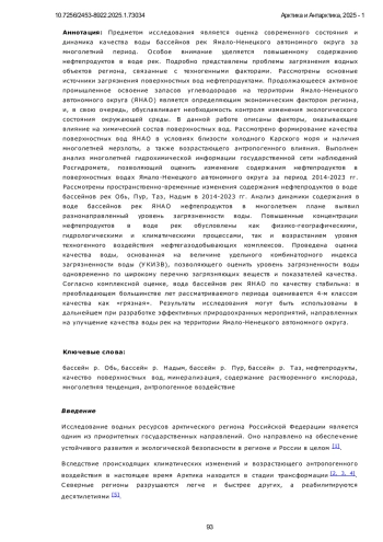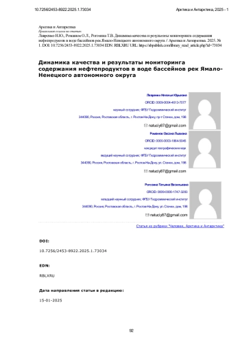 Предметом исследования является оценка современного состояния и динамика качества воды бассейнов рек Ямало-Ненецкого автономного округа за многолетний период. Особое внимание уделяется повышенному содержанию нефтепродуктов в воде рек. Подробно представлены проблемы загрязнения водных объектов региона, связанные с техногенными факторами. Рассмотрены основные источники загрязнения поверхностных вод нефтепродуктами. Продолжающееся активное промышленное освоение запасов углеводородов на территории Ямало-Ненецкого автономного округа (ЯНАО) является определяющим экономическим фактором региона, и, в свою очередь, обуславливает необходимость контроля изменения экологического состояния окружающей среды. В данной работе описаны факторы, оказывающие влияние на химический состав поверхностных вод. Рассмотрено формирование качества поверхностных вод ЯНАО в условиях близости холодного Карского моря и наличия многолетней мерзлоты, а также возрастающего антропогенного влияния. Выполнен анализ многолетней гидрохимической информации государственной сети наблюдений Росгидромета, позволяющий оценить изменение содержания нефтепродуктов в поверхностных водах Ямало-Ненецкого автономного округа за период 2014-2023 гг. Рассмотрены пространственно-временные изменения содержания нефтепродуктов в воде бассейнов рек Обь, Пур, Таз, Надым в 2014-2023 гг. Анализ динамики содержания в воде бассейнов рек ЯНАО нефтепродуктов в многолетнем плане выявил разнонаправленный уровень загрязненности воды. Повышенные концентрации нефтепродуктов в воде рек обусловлены как физико-географическими, гидрологическими и климатическими процессами, так и возрастанием уровня техногенного воздействия нефтегазодобывающих комплексов. Проведена оценка качества воды, основанная на величине удельного комбинаторного индекса загрязненности воды (УКИЗВ), позволяющего оценить уровень загрязненности воды одновременно по широкому перечню загрязняющих веществ и показателей качества. Согласно комплексной оценке, вода бассейнов рек ЯНАО по качеству стабильна: в преобладающем большинстве лет рассматриваемого периода оценивается 4-м классом качества как «грязная». Результаты исследования могут быть использованы в дальнейшем при разработке эффективных природоохранных мероприятий, направленных на улучшение качества воды рек на территории Ямало-Ненецкого автономного округа.