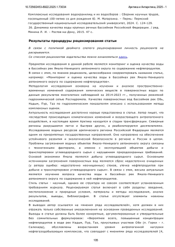 25. Лавренко Н. Ю. Результаты мониторинга качества воды бассейнов рек Ямало-Ненецкого автономного округа / Н. Ю. Лавренко, О. Л. Романюк, Т. В. Рогозина // Комплексные исследования водохранилищ и их водосборов: Сборник научных трудов, посвященный 100-летию со дня рождения Ю. М. Матарзина. - Пермь: Пермский государственный национальный исследовательский университет, 2024. С. 124-129. EDN: MDMUDX