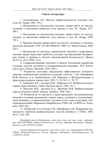 11. Рубинский А.А, Колчин Г.И., Никифоров А.В. Повышение безопасности отработки выбросоопасных пластов Донбасса // ГИАБ. 2002. № 6. С.145-146.