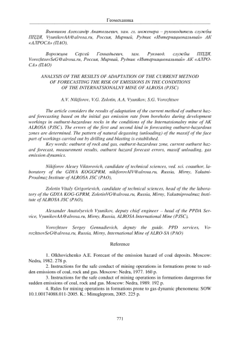 Рассмотрены результаты адаптации текущего способа прогноза выбросоопасности по начальной скорости газовыделения из шпуров при проведении подготовительных выработок по выбросоопасным породам в условиях рудника «Интернациональный» АК АЛРОСА (ПАО). Определены ошибки первого и второго рода при прогнозировании выбросоопасных зон, установлена закономерность естественной дегазации (разгрузки) массива призабойной части выработок, проводимых буровзрывным способом.