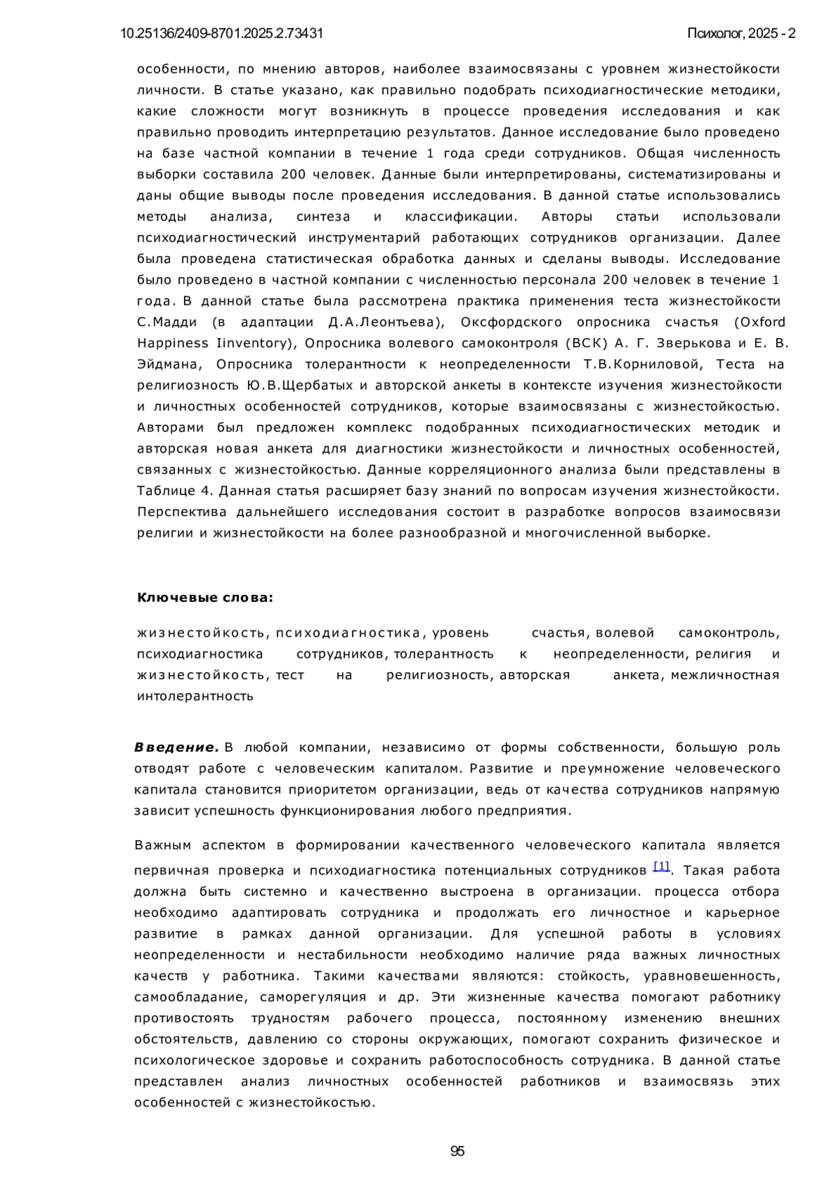Важным аспектом в формировании качественного человеческого капитала является первичная проверка и психодиагностика потенциальных сотрудников [1]. Такая работа должна быть системно и качественно выстроена в организации. процесса отбора необходимо адаптировать сотрудника и продолжать его личностное и карьерное развитие в рамках данной организации. Для успешной работы в условиях неопределенности и нестабильности необходимо наличие ряда важных личностных качеств у работника. Такими качествами являются: стойкость, уравновешенность, самообладание, саморегуляция и др. Эти жизненные качества помогают работнику противостоять трудностям рабочего процесса, постоянному изменению внешних обстоятельств, давлению со стороны окружающих, помогают сохранить физическое и психологическое здоровье и сохранить работоспособность сотрудника. В данной статье представлен анализ личностных особенностей работников и взаимосвязь этих особенностей с жизнестойкостью.