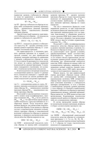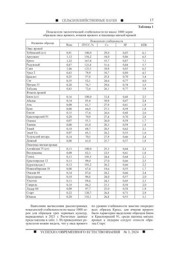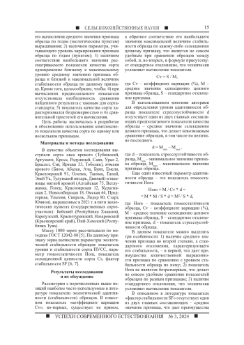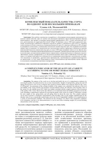 Цель работы заключалась в разработке и обосновании использования комплексного показателя оценки качества сорта по одному или нескольким признакам. Были проанализированы образцы ячменя ярового, овса ярового и пшеницы мягкой яровой, выращенные в 2021 г. в пяти экологических пунктах, расположенных на территории Восточной Сибири. По признаку «масса 1000 зерен» вычисляли параметры экологической стабильности образцов: показатель уровня и стабильности сорта (ПУСС), параметр гомеостатичности (Hom), показатель селекционной ценности сорта (Cs), фактор стабильности (SF), которые в дальнейшем соотносились с комплексным показателем оценки качества сорта. На основании полученных данных было установлено, что практически все используемые в работе параметры стабильности, включая комплексный показатель оценки качества сорта, по массе 1000 зерен оценивают один и тот же образец овса, ячменя яровых и пшеницы мягкой яровой практически одинаково. Данный комплексный показатель возможно использовать для выполнения сравнительного определения селекционной ценности образцов сельскохозяйственных культур одновременно и по абсолютной величине какого-либо хозяйственно полезного признака, и по уровню адаптивности (стабильности) его проявления в разнообразных экологических условиях. Этот показатель по сравнению с другими имеет преимущество, заключающееся в сравнительной простоте его вычисления, а в силу своей безразмерности может использоваться при выполнении оценки образцов по нескольким селекционным признакам одновременно.