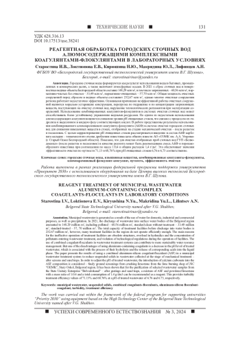 Городские сточные воды формируются как результат использования воды в бытовых, промышленных и коммерческих целях, а также включают атмосферные осадки. В 2021 г. сброс сточных вод в поверхностные водные объекты Белгородской области составил 148,29 млн м3, в том числе загрязненных - 60,56 млн м3, нормативно-чистых без очистки - 33,49 млн м3, нормативно-очищенных - 57,70 млн м3. Общая мощность очистных сооружений перед сбросом в водные объекты составляет 232,67 млн м3, однако многие очистные сооружения региона работают недостаточно эффективно. Основными причинами неэффективной работы очистных сооружений являются морально устаревшие конструкции, перегрузка по гидравлике и по концентрации загрязняющих веществ, поступающих на очистку сточных вод, нарушение технологических регламентов при эксплуатации сооружений. Использование комбинированных коагулянтов-флокулянтов в системах очистки сточных вод может способствовать более устойчивому управлению водными ресурсами. Но одним из недостатков использования алюмосодержащих коагулянтов является снижение уровня рН очищенных стоков, что связано с процессом их гидролиза и выделением в жидкую фазу соответствующих кислот. В работе представлены результаты использования комбинированного алюмокремниевого коагулянта-флокулянта (АКФ) в системе очистки городских сточных вод для снижения взвешенных веществ в стоках, отобранных на стадии механической очистки - после решеток и песколовок. С целью корректирования рН очищенных стоков рассматривается введение в состав АКФ карбоната кальция - тонкомолотого отсева дробления известняка цеха обжига извести АО «ОЭМК им. А. А. Угарова» (г. Старый Оскол Белгородской области). Показано, что для очистки отобранных проб сточных вод ГУП «Белводоканал» (после решеток и песколовок) в качестве реагента может быть рекомендована смесь АКФ и порошкообразного известняка при соотношении по массе 1:0,4 и общим расходом 1,4 г/дм3. Это обеспечивает значения эффективности очистки по мутности 71,13 и 68,76 % при рН очищенных стоков 6,76 и 6,73 соответственно.