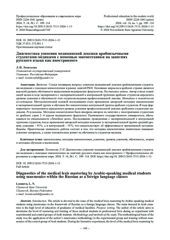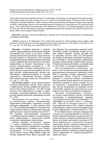 Введение. Статья посвящена вопросу усвоения медицинской лексики арабоязычными студентами-медиками с помощью мнемотехники в рамках занятий РКИ. Основным запросом в арабских странах является высокий уровень обученности выпускников медицинских факультетов.
