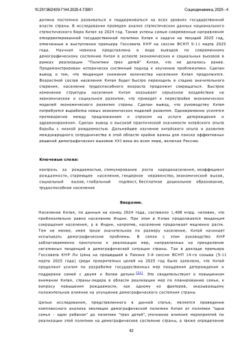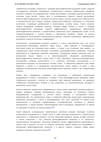 9. 	Манухина О.В. Аспекты демографической политики КНР в 1949-2023 годах / О.В. Манухина // Народонаселение. 2024. № 4. С. 47-58. DOI: 10.24412/1561-7785-2024-4-47-58
