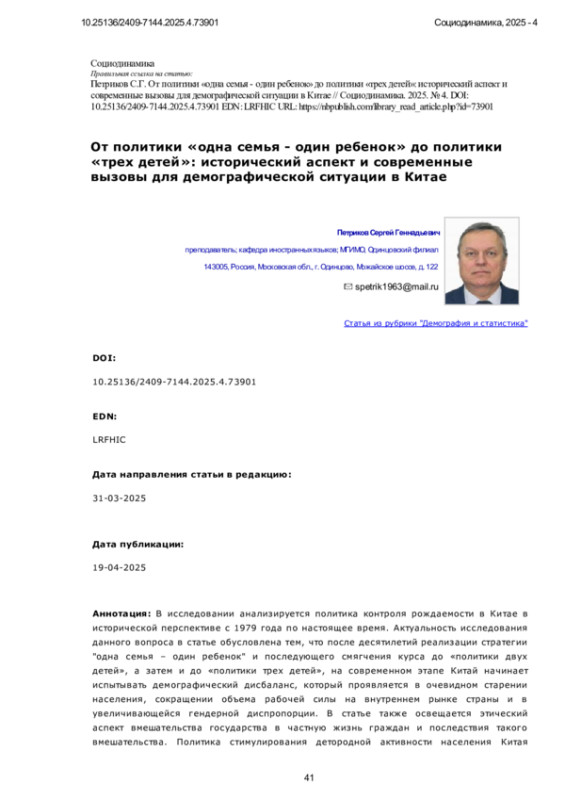 В исследовании анализируется политика контроля рождаемости в Китае в исторической перспективе с 1979 года по настоящее время. Актуальность исследования данного вопроса в статье обусловлена тем, что после десятилетий реализации стратегии “одна семья - один ребенок” и последующего смягчения курса до «политики двух детей», а затем и до «политики трех детей», на современном этапе Китай начинает испытывать демографический дисбаланс, который проявляется в очевидном старении населения, сокращении объема рабочей силы на внутреннем рынке страны и в увеличивающейся гендерной диспропорции. В статье также освещается этический аспект вмешательства государства в частную жизнь граждан и последствия такого вмешательства. Политика стимулирования детородной активности населения Китая должна постоянно развиваться и поддерживаться на всех уровнях государственной власти страны. В исследовании проведен анализ статистических данных национального статистического бюро Китая за 2024 год. Также учтены самые современные направления откорректированной государственной политики Китая и задачи на текущий 2025 год, отмеченные в выступлении премьера Госсовета КНР на сессии ВСНП 5-11 марта 2025 года. Научная новизна представлена в виде выводов по современному демографическому состоянию Китая в аспекте экономических и социальных вызовов в рамках реализации “Политики трех детей” Китая, что не делалось ранее. Продемонстрирован исторически системный подход к изучению проблематики. Сделан вывод о том, что тенденция снижения количества населения Китая продолжится. Возрастной состав населения Китая будет быстро переходить в стадию значительного старения, население трудоспособного возраста продолжит сокращаться. Быстрое изменение структуры населения Китая оказывает серьезное воздействие на экономическое и социальное развитие, что приведет к перестройке экономических моделей экономического развития страны. Сделан вывод, что руководству Китая потребуется выработка новых экономических моделей развития. Одновременно усилятся противоречие между предложением и спросом на услуги деторождения и здравоохранения. Сделан вывод о высокой практической значимости китайского опыта борьбы с низкой рождаемостью. Дальнейшее изучение китайского опыта и развитие международного сотрудничества в этой области крайне важны для поиска эффективных решений демографических вызовов XXI века во всем мире, включая Россию.