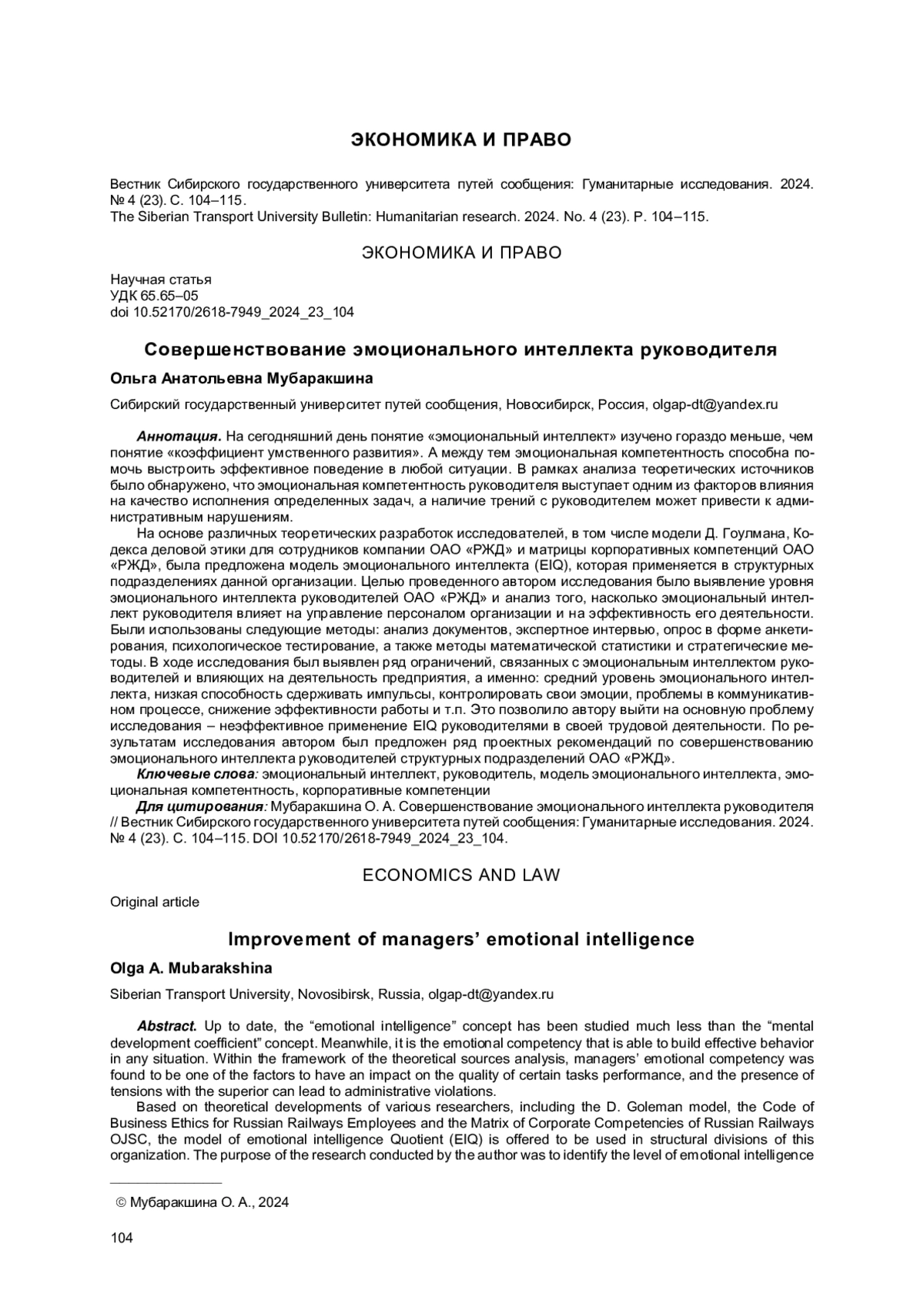 5. Мубаракшина О. А., Козырь А. Р. Применение модели эмоционально интеллекта Дэниэла Гоулмана в современных организациях // Научные исследования в современном мире. Теория и практика: Сборник избранных статей Всероссийской (национальной) научно-практической конференции. СПб.: ГНИИ “Нацразвитие”, 2022. С. 84-87. EDN: ZIJVAL