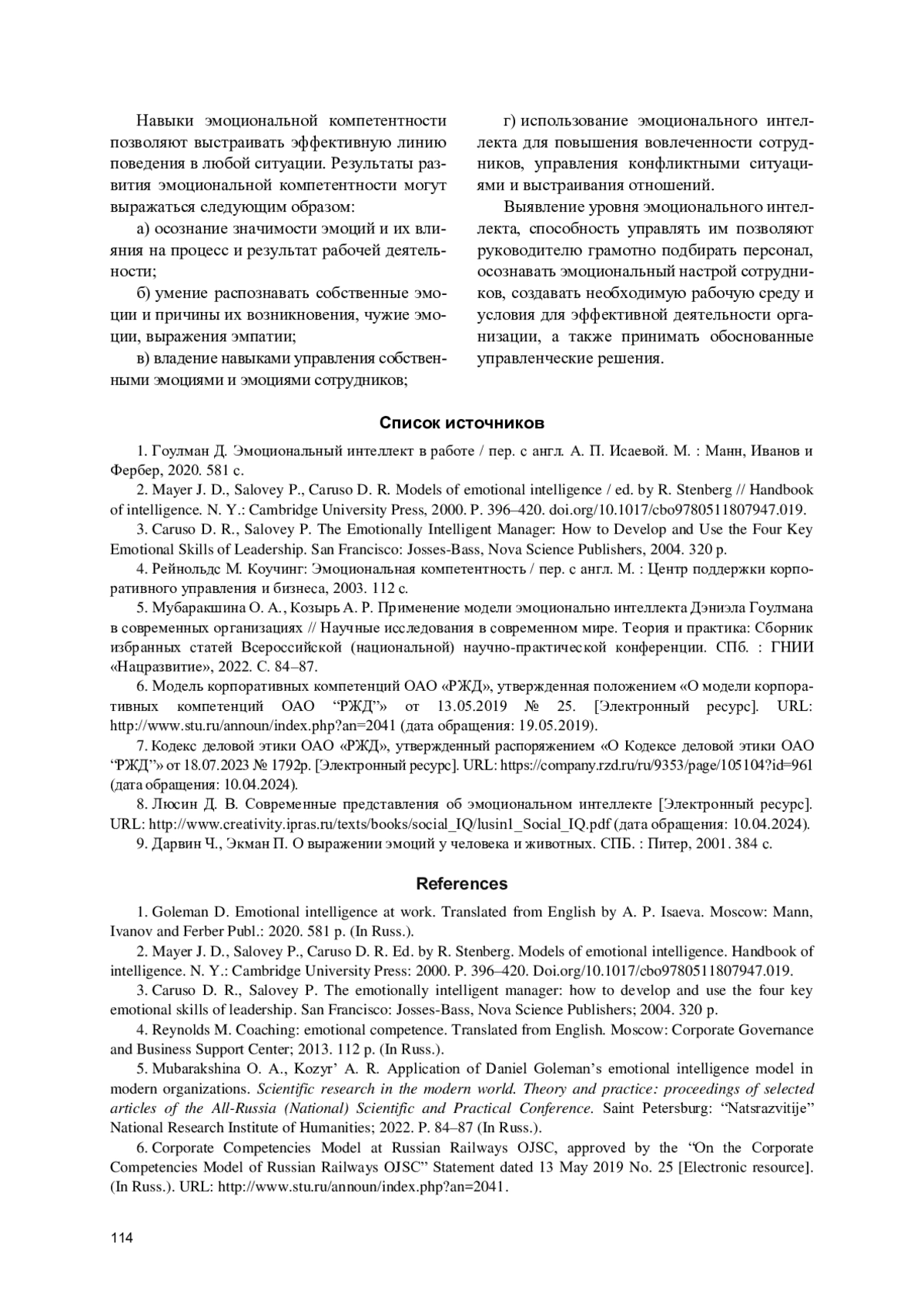 8. Люсин Д. В. Современные представления об эмоциональном интеллекте [Электронный ресурс]. URL: http://www.creativity.ipras.m/texts/books/sotial_IQ/lusm1_Sotial_IQ.pdf (дата обращения: 10.04.2024). EDN: UVGYGB