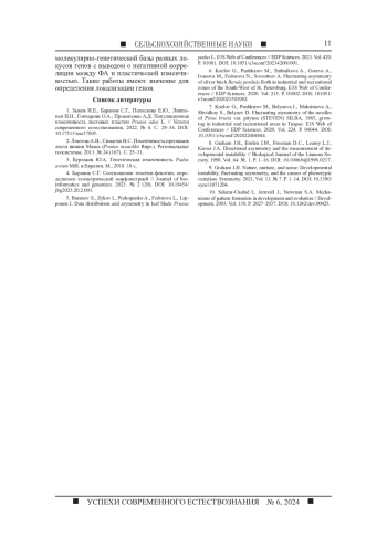 6. Kozlov G., Pushkarev M., Trubnikova A., Goreva A., Ivanova M., Fedorova N., Sovestnov A. Fluctuating asymmetry of silver birch Betula pendula Roth in industrial and recreational zones of the South-West of St. Petersburg. E3S Web of Conferences // EDP Sciences. 2020. Vol. 215. P. 03002. DOI: 101051/e3sconf/202021503002. EDN: EEPQUC