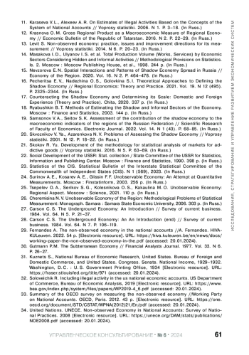 1. Аброскин А. С., Аброскина Н. А. Методология и практика измерения теневой деятельности в экономике Российской Федерации. РАНХиГС. М.: Дело, 2021. 107 с. EDN: UVPHCH