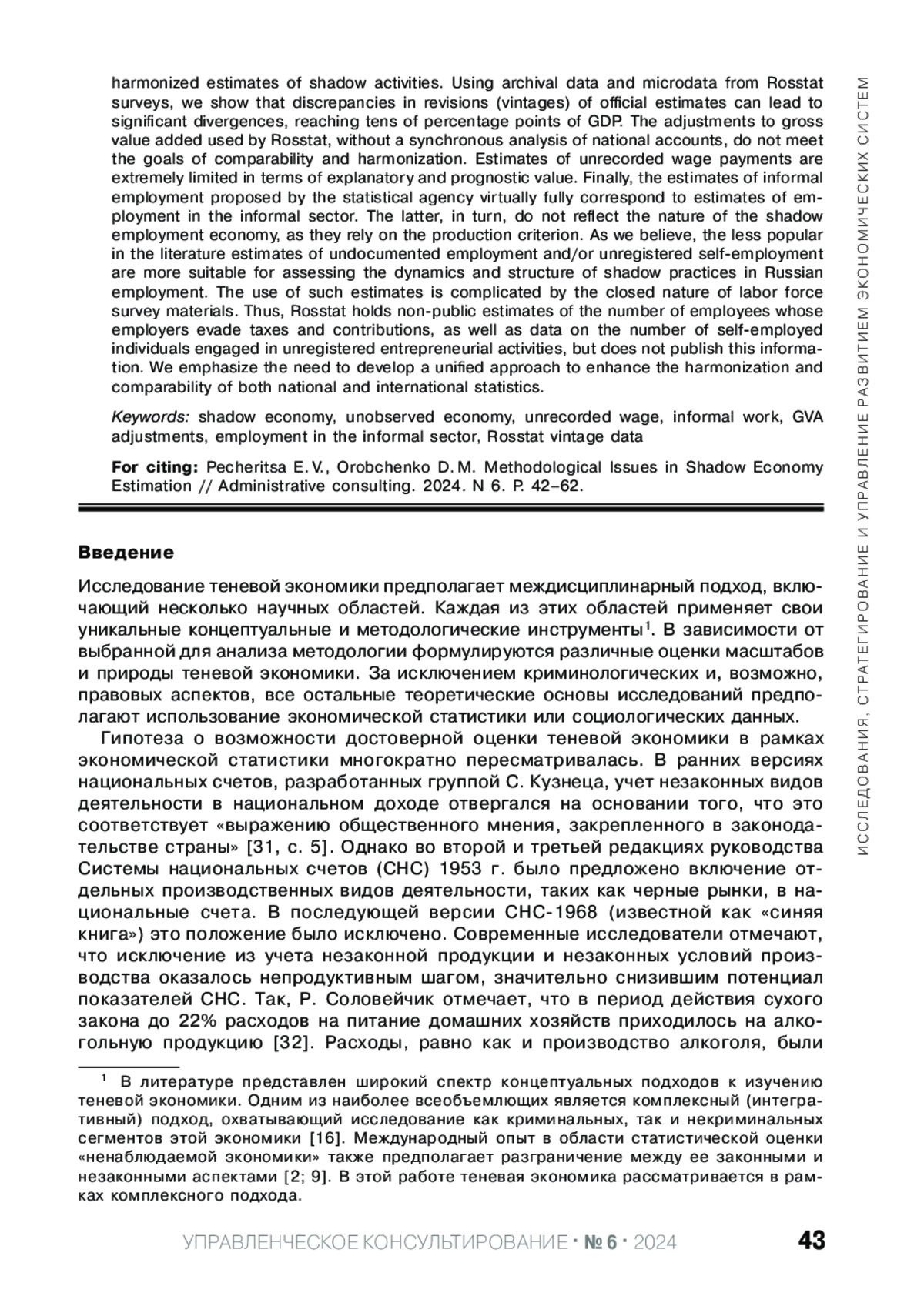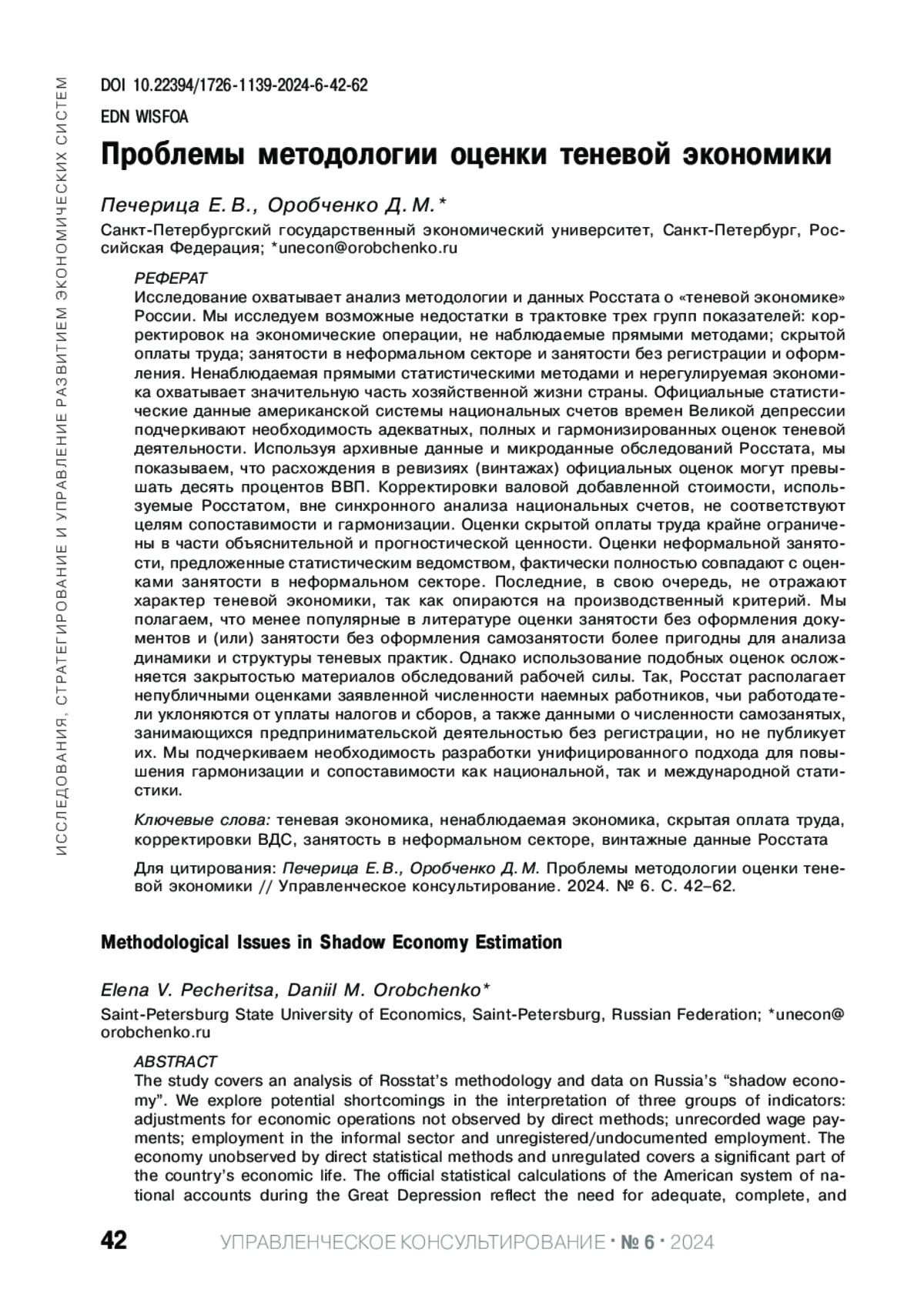 The study covers an analysis of Rosstat’s methodology and data on Russia’s “shadow economy”. We explore potential shortcomings in the interpretation of three groups of indicators: adjustments for economic operations not observed by direct methods; unrecorded wage payments; employment in the informal sector and unregistered/undocumented employment. The economy unobserved by direct statistical methods and unregulated covers a significant part of the country’s economic life. The official statistical calculations of the American system of national accounts during the Great Depression reflect the need for adequate, complete, and harmonized estimates of shadow activities. Using archival data and microdata from Rosstat surveys, we show that discrepancies in revisions (vintages) of official estimates can lead to significant divergences, reaching tens of percentage points of GDP. The adjustments to gross value added used by Rosstat, without a synchronous analysis of national accounts, do not meet the goals of comparability and harmonization. Estimates of unrecorded wage payments are extremely limited in terms of explanatory and prognostic value. Finally, the estimates of informal employment proposed by the statistical agency virtually fully correspond to estimates of employment in the informal sector. The latter, in turn, do not reflect the nature of the shadow employment economy, as they rely on the production criterion. As we believe, the less popular in the literature estimates of undocumented employment and/or unregistered self-employment are more suitable for assessing the dynamics and structure of shadow practices in Russian employment. The use of such estimates is complicated by the closed nature of labor force survey materials. Thus, Rosstat holds non-public estimates of the number of employees whose employers evade taxes and contributions, as well as data on the number of self-employed individuals engaged in unregistered entrepreneurial activities, but does not publish this information. We emphasize the need to develop a unified approach to enhance the harmonization and comparability of both national and international statistics.