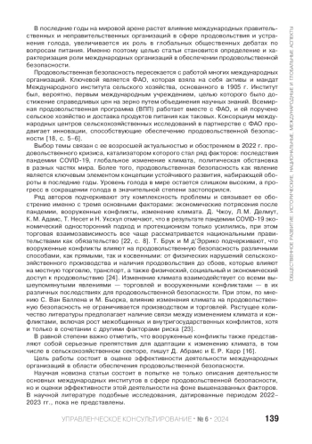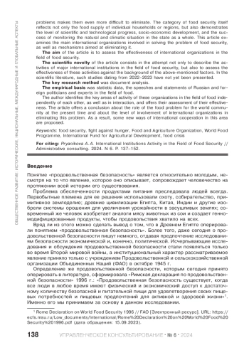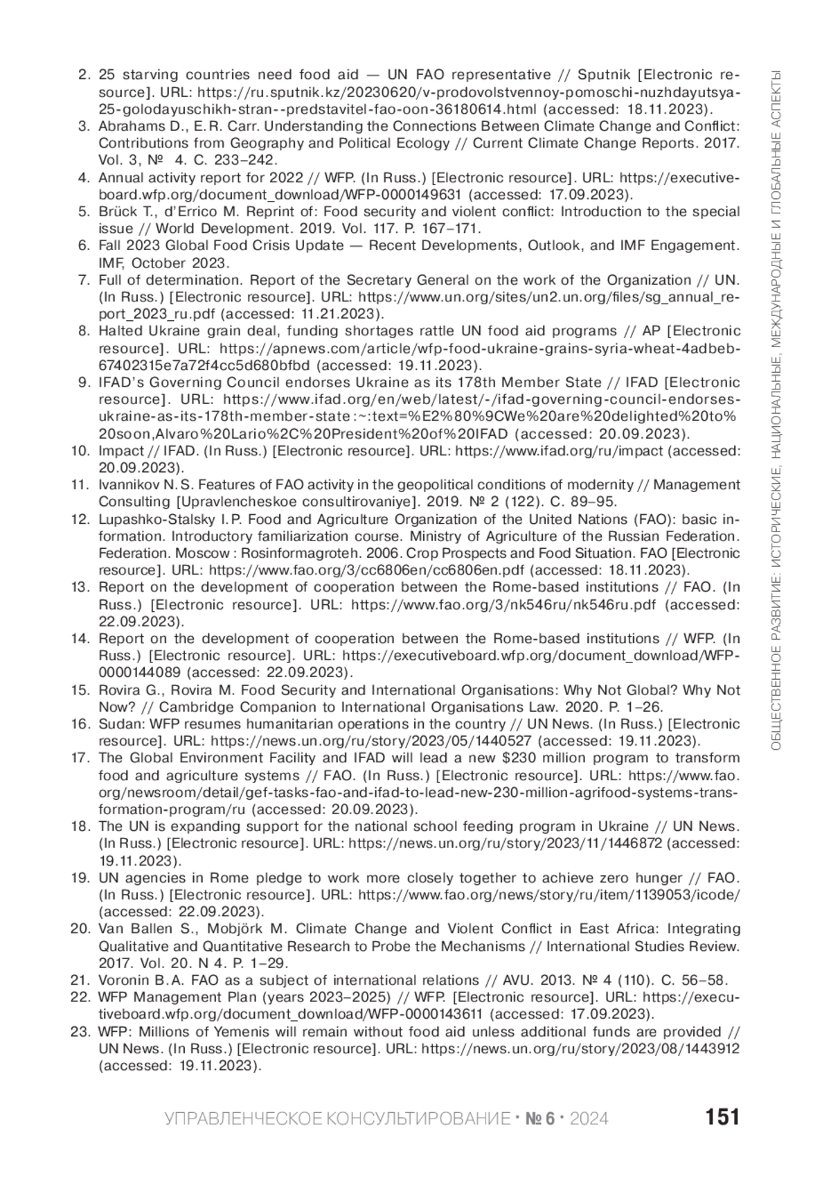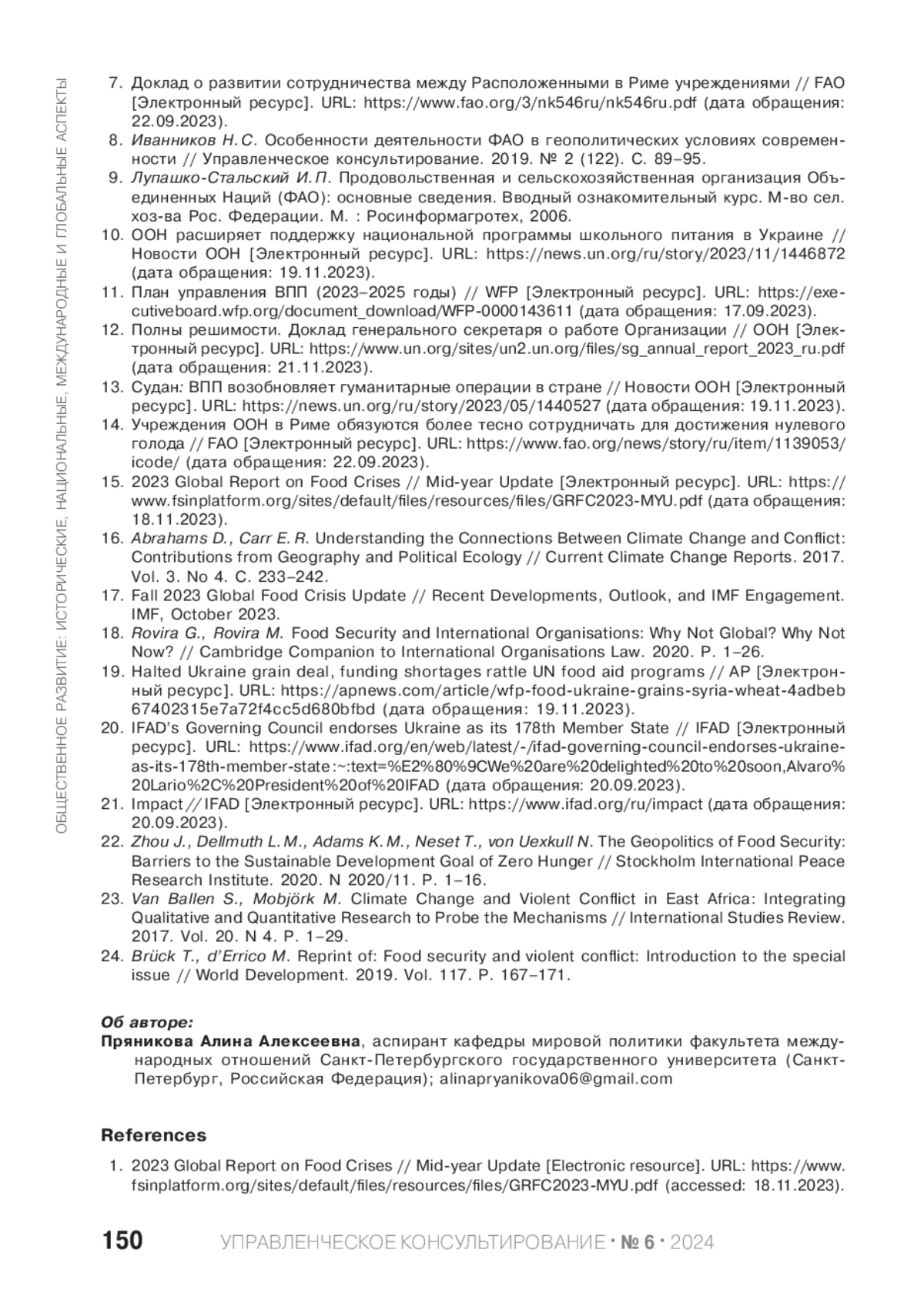 8. Иванников Н. С. Особенности деятельности ФАО в геополитических условиях современности // Управленческое консультирование. 2019. № 2 (122). С. 89-95. EDN: DNWFRQ