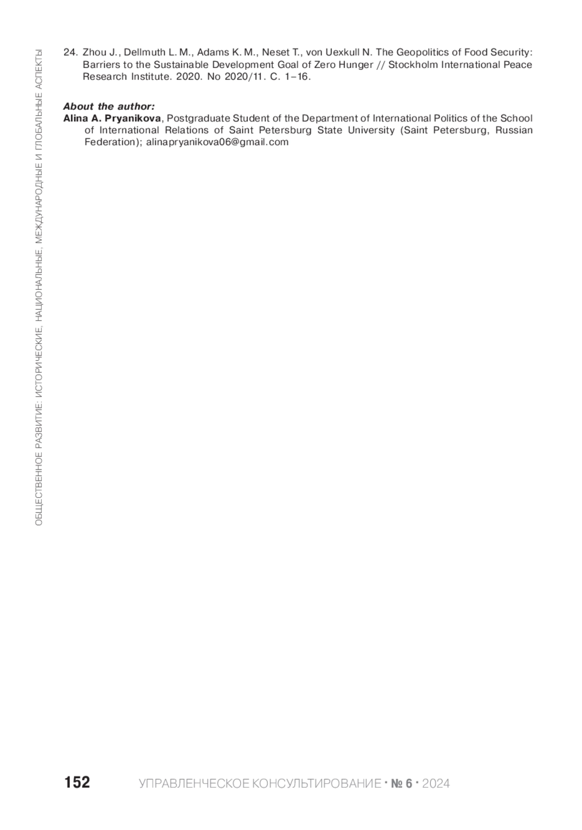 22. Zhou J., Dellmuth L. M., Adams K. M., Neset T., von Uexkull N. The Geopolitics of Food Security: Barriers to the Sustainable Development Goal of Zero Hunger // Stockholm International Peace Research Institute. 2020. N 2020/11. P. 1-16.