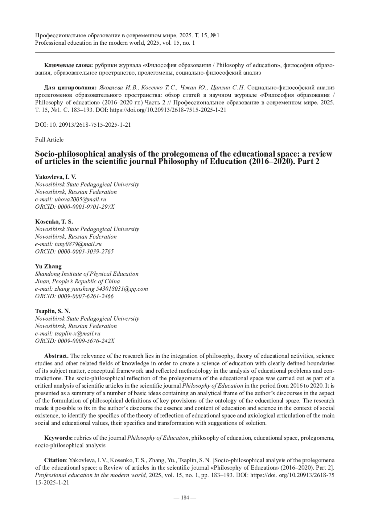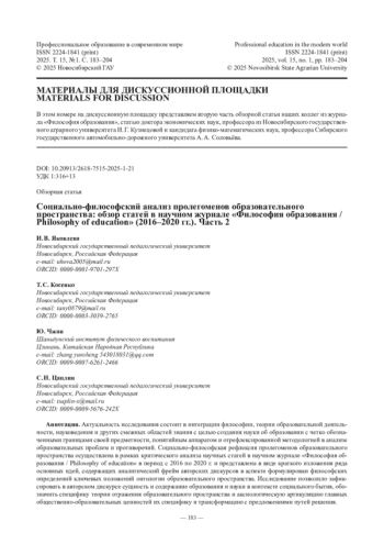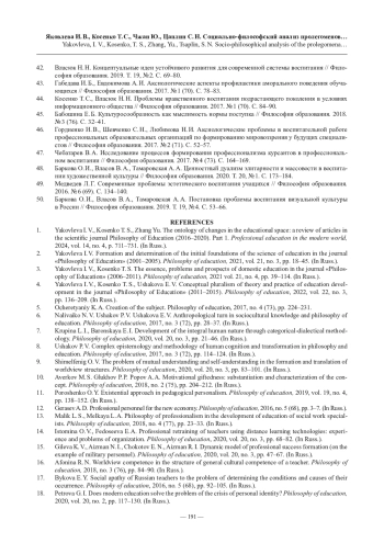 1. Яковлева И. В., Косенко Т. С., Чжан Ю. Онтология изменений образовательного пространства: обзор статей в научном журнале «Философия образования / Philosophy of education» (2016-2020 гг.). Часть 1 // Профессиональное образование в современном мире. 2024. Т. 14, № 4. С. 711-731.