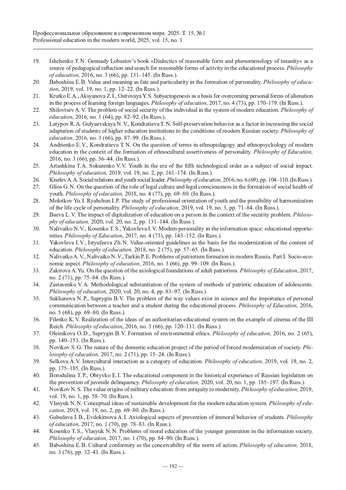42. Власюк Н. Н. Концептуальные идеи устойчивого развития для современной системы воспитания // Философия образования. 2019. Т. 19, № 2. С. 69-80.