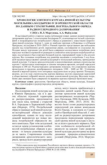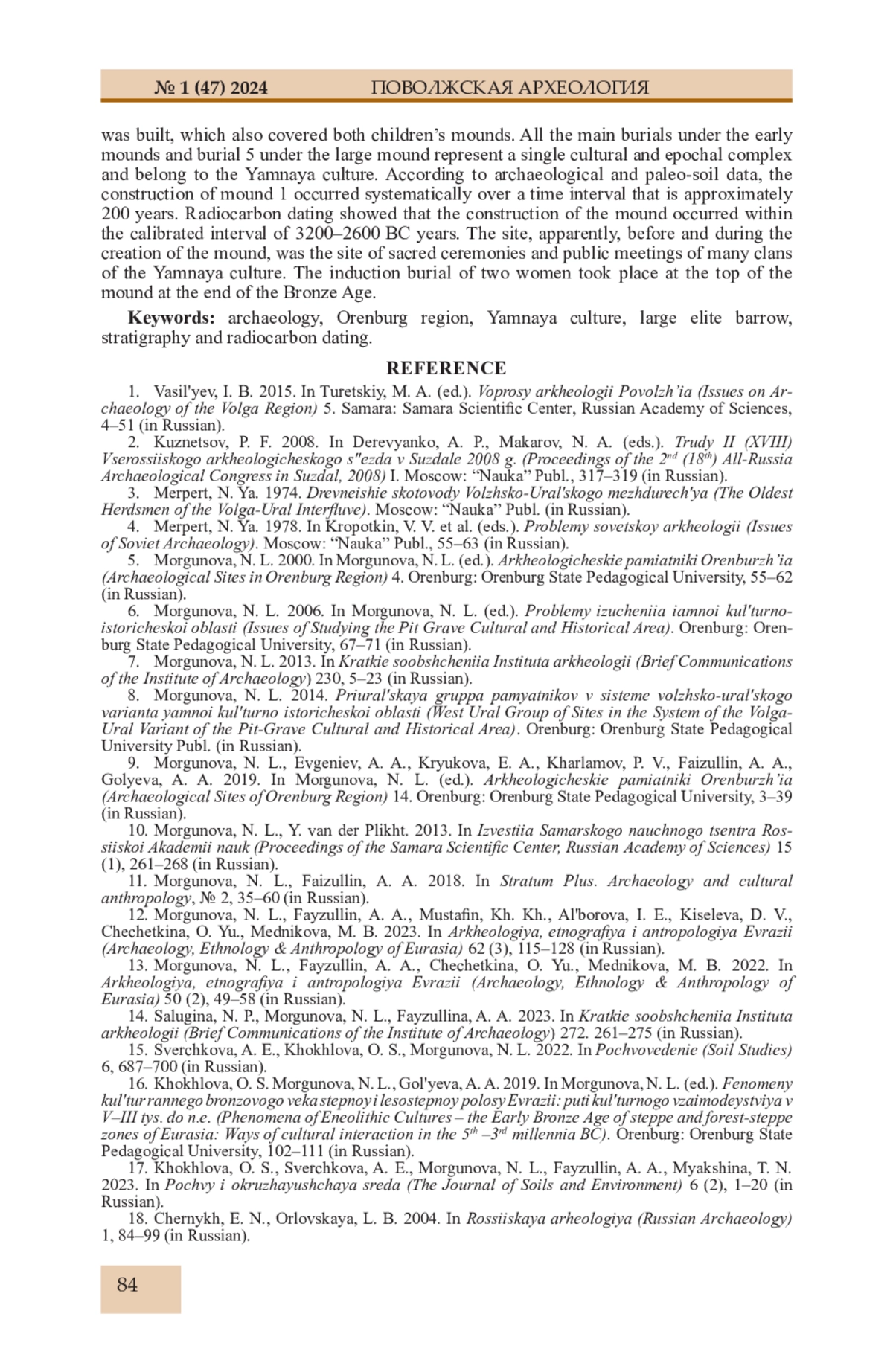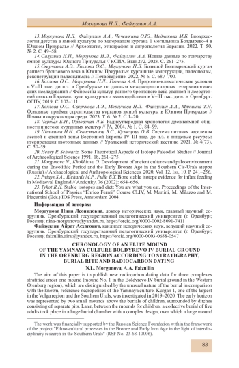 12. Моргунова Н.Л., Файзуллин А.А., Мустафин Х.Х., Альборова И.Э., Киселева Д.В., Чечеткина О.Ю., Медникова М.Б. О статусе и избирательности детских погребений ямной археологической культуры Южного Урала (по материалам раскопок кургана 1 группы Болдырево-4) // Вестник археологии, антропологии и этнографии. 2023. № 3 (62). С. 115-128. EDN: PLTOXQ