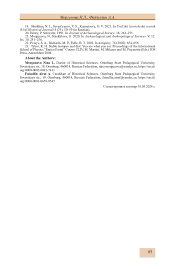 21. Morgunova N., Khokhlova O. Development of ancient cultures and paleoenvironment during the Eneolithic Period and the Early Bronze Age in the Southern Cis-Urals steppe (Russia) // Archaeological and Anthropological Sciences. 2020. Vol. 12. Iss. 10. Р. 241-256. EDN: YSMKFT