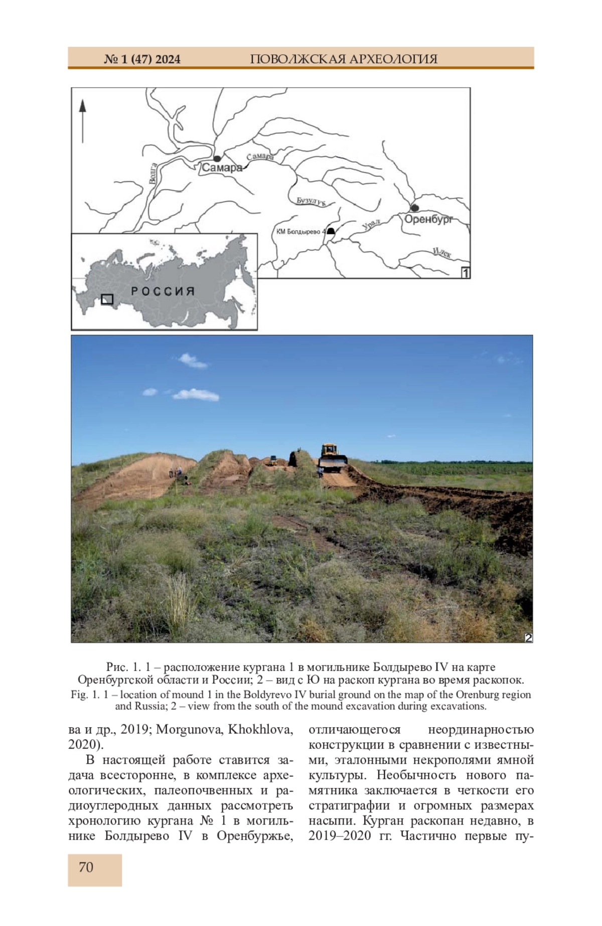 В настоящей работе ставится задача публикации новых данных радиоуглеродного датирования кургана 1 в могильнике Болдырево IV, отличающегося четкой стратиграфией и неординарностью погребального обряда в сравнении с известными некрополями ямной культуры. Курган 1, один из наиболее крупных в Поволжье и в Южном Приуралье, исследован в 2019-2020 гг. Ранний горизонт представляли две небольшие насыпи над погребениями детей, окруженные рвами, состоявшими из отдельных ям. Позднее между курганами для детей было совершено коллективное погребение пяти взрослых человек в огромной по размерам и сложной по конструкции погребальной камере, над которым и был сооружен большой курган, перекрывший также и оба детских кургана. Все основные погребения под ранними насыпями и погребение 5 под большой насыпью представляют единый культурный и эпохальный комплекс, принадлежат ямной культуре. Согласно археологическим и палеопочвенным данным строительство кургана 1 происходило планомерно в течение интервала времени, который определен примерно в 200 лет. Радиоуглеродное датирование показало, что сооружение кургана происходило в пределах калиброванного интервала 3300 - 2600 лет ВС. Уточнение нижней и верхней границ этого интервала затруднительно по ряду причин. Площадка, видимо, до и по ходу строительства кургана являлась местом сакральных церемоний и общественных собраний многих родовых кланов ямной культуры. Впускное погребение двух женщин было совершено на вершине кургана в финале бронзового века.