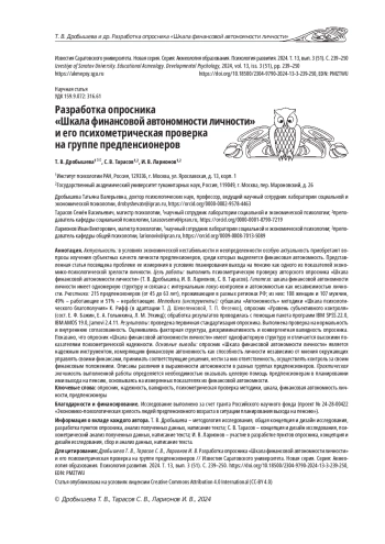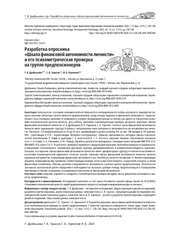 15. Дробышева Т. В. Понятие “экономико-психологическая зрелость” личности и его операционализация // Вестник Московского государственного областного университета. Серия: Психологические науки. 2021. № 1. С. 74-83. ,. DOI: 10.18384/2310-7235-2021-1-74-83 EDN: CMFQPJ