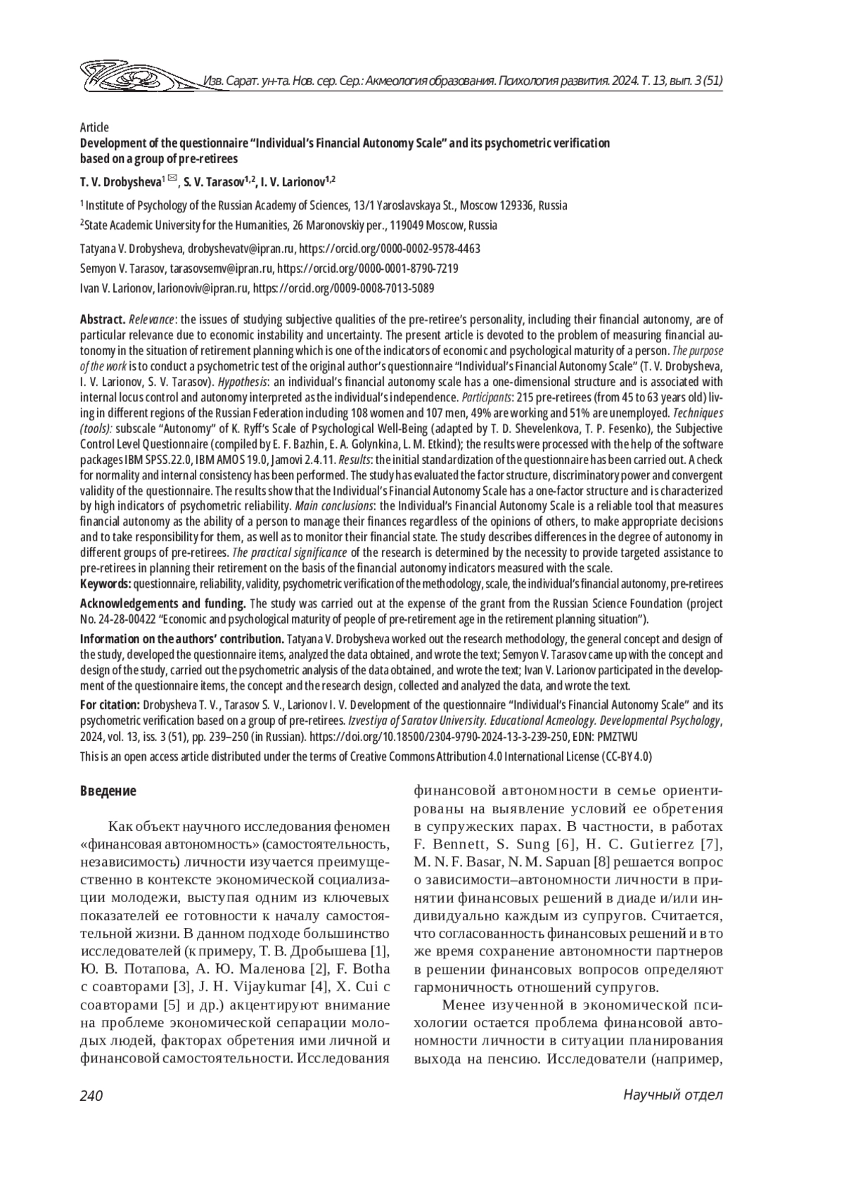 Актуальность: в условиях экономической нестабильности и неопределенности особую актуальность приобретают вопросы изучения субъектных качеств личности предпенсионеров, среди которых выделяется финансовая автономность. Представленная статья посвящена проблеме ее измерения в условиях планирования выхода на пенсию как одного из показателей экономико-психологической зрелости личности. Цель работы: выполнить психометрическую проверку авторского опросника «Шкала финансовой автономности личности» (Т. В. Дробышева, И. В. Ларионов, С. В. Тарасов). Гипотеза: шкала финансовой автономности личности имеет одномерную структуру и связана с интернальным локус-контролем и автономностью как независимостью личности. Участники: 215 предпенсионеров (от 45 до 63 лет), проживающие в разных регионах РФ; из них: 108 женщин и 107 мужчин, 49% – работающие и 51% – неработающие. Методики (инструменты): субшкала «Автономность» методики «Шкала психологического благополучия» К. Рифф (в адаптации Т. Д. Шевеленковой, Т. П. Фесенко), опросник «Уровень субъективного контроля» (сост. Е. Ф. Бажин, Е. А. Голынкина, Л. М. Эткинд); обработка результатов проводилась с помощью пакета программ IBM SPSS.22.0, IBM AMOS 19.0, Jamovi 2.4.11.