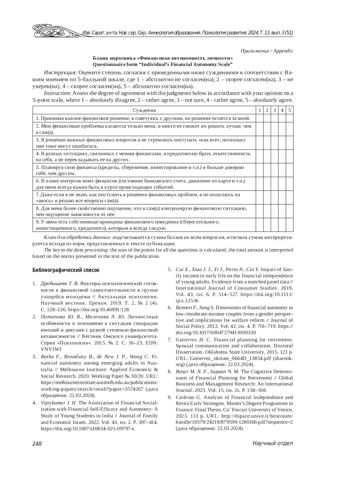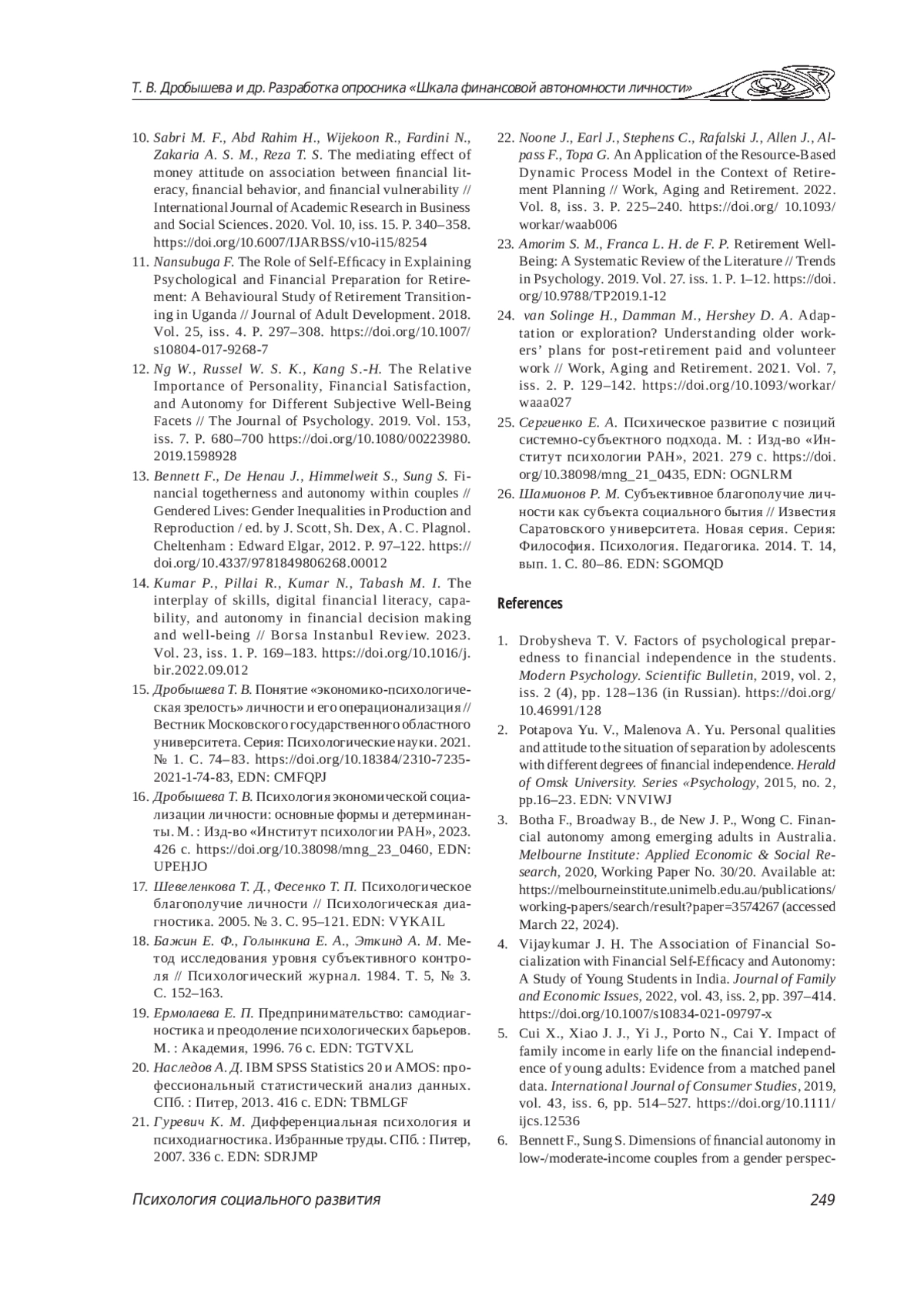 1. Дробышева Т. В. Факторы психологической готовности к финансовой самостоятельности в группе учащейся молодежи // Актуальная психология. Научный вестник. Ереван. 2019. Т. 2, № 2 (4). С. 128-136. DOI: 10.46991/128